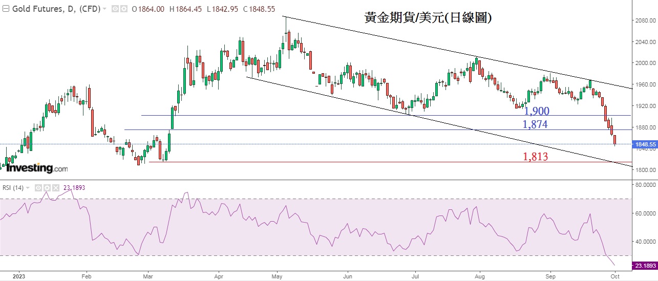 美元强势令金价下跌,不过要留意,黄金期货日线图RSI 已跌至23,低于30属于超卖区,23数值属严重超卖,鉴于美元指数及美债息已升至超买水平,故不排除黄金期货在短期内出现技术性反弹。