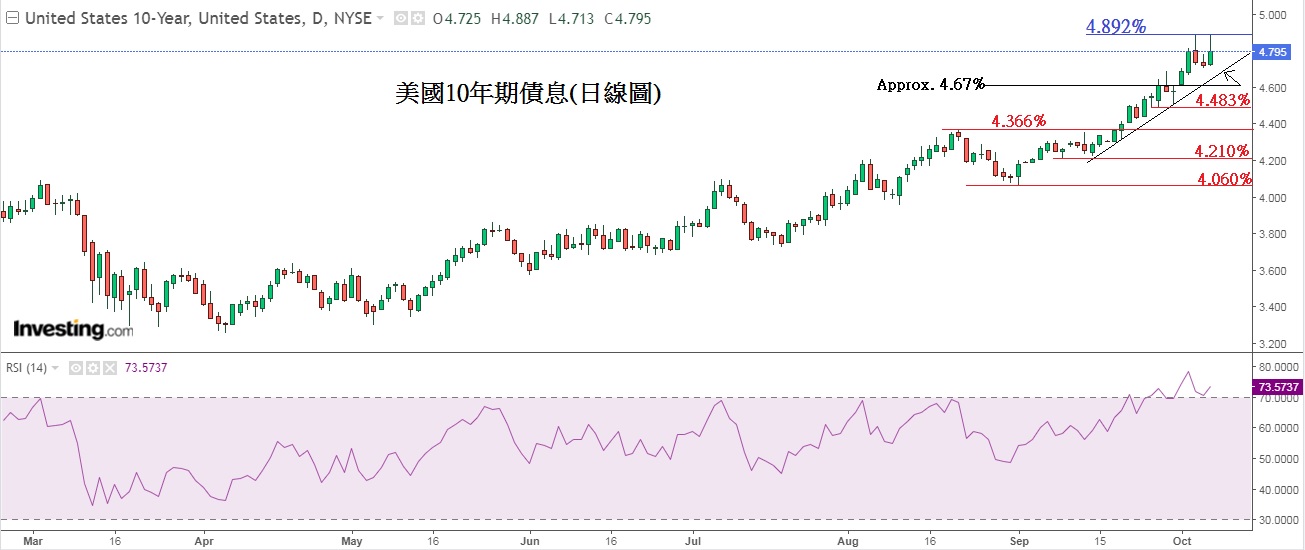 从下方的美国10年期债息(日线图)来看,美债息上周在4.892%可能造了「双顶」,显示债息在此高位可能造了顶部,债息后市应向下走。但上周五收市形成了一个「阳烛」,而并非「阴烛」,技术上反映债息可能仍有上升动力。因此不敢武断本周债息是否在4.892%造了顶部,所以要留意本周多位FED官员的话风及CPI结果。