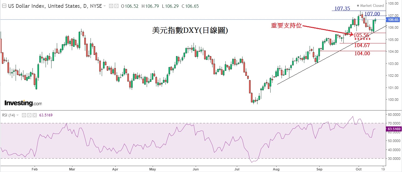 下方是美元指数DXY(日线图),上周初开始,受到部份联储局官员放鸽,美元指数一直下滑至图中的上升通道底部,但至周四(12)因美国CPI结果轻微较预测上升0.1%,令加息预期升温,导致美元反弹,可看到周四收市后造成了一个绿色大阳烛。周五(13)受到伊朗警告或要军事介入巴以冲突下,避险情绪继续支持美元上升,因美元与黄金同样是避险资产,但美元升势较弱,原因可能是上初有联储局官员放鸽,显示美元利率及债息或已见顶,反映避险资金较倾向买入黄金,令金价升势比美元显著凌厉。因此本周密切留意10位联储局官员中,会否有更多官员放鸽。