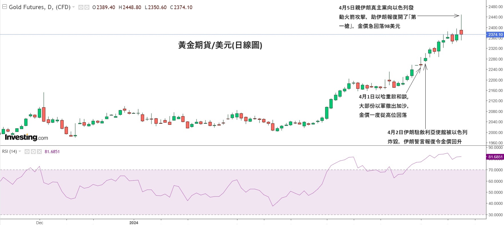 见下图,4月1日当日是以色列与哈马斯重启停火和谈的日子,令中东紧张气氛有所缓和,金价也在当日出现回落,而且当晚收盘后其阴阳烛出现低收形态,反映金价后市应该向下跌。但在中东零晨时分(即香港2日),以色列用导弹炸毁伊朗驻叙利亚使馆,伊朗誓言要报复,中东紧张气氛再升温,避险情绪再推升金价,由于伊朗与以色列开战是大型风险事件,金价本来已处于超买水平,但这个风险事件令金价从4月2日至上周五(12日)升近200美元,周五黄金期货最高升至2448美元新高(现货金2431美元), 可见今次黄金升势相当极端。