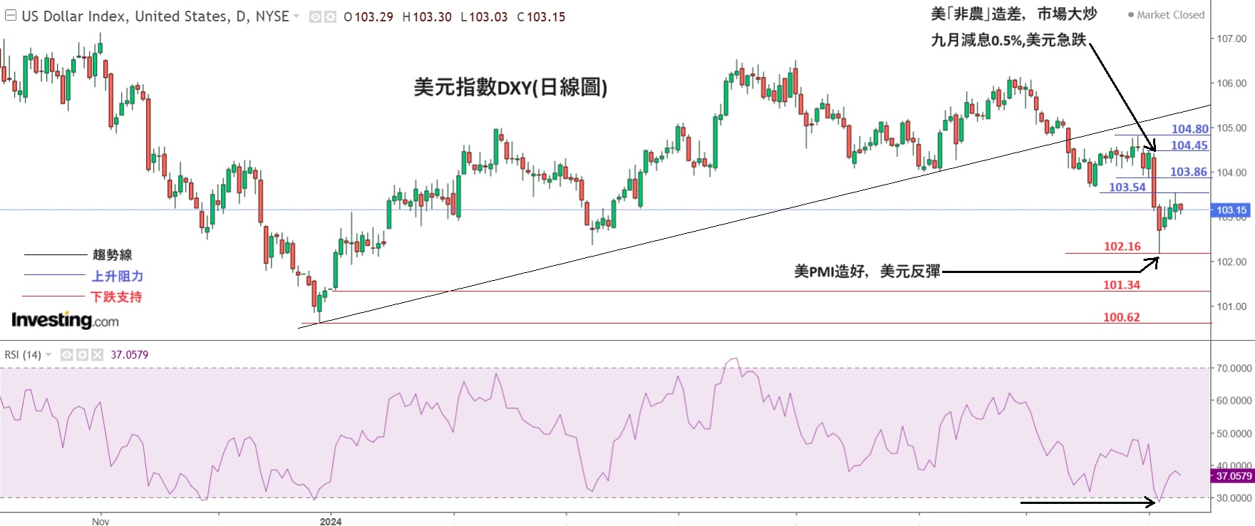 上周一(5日),美国公布了7月ISM 服务业PMI指数,结果比前值大幅造好,结果是51.4,预测是51,前值是48.8,服务业PMI 升回盛衰分界线50之上,强劲的PMI 令下跌了不少美元显著反弹,数据公布前,美元指数DXY 是102.16,公布后美元作出反弹,至周五美元指数收在103.12。