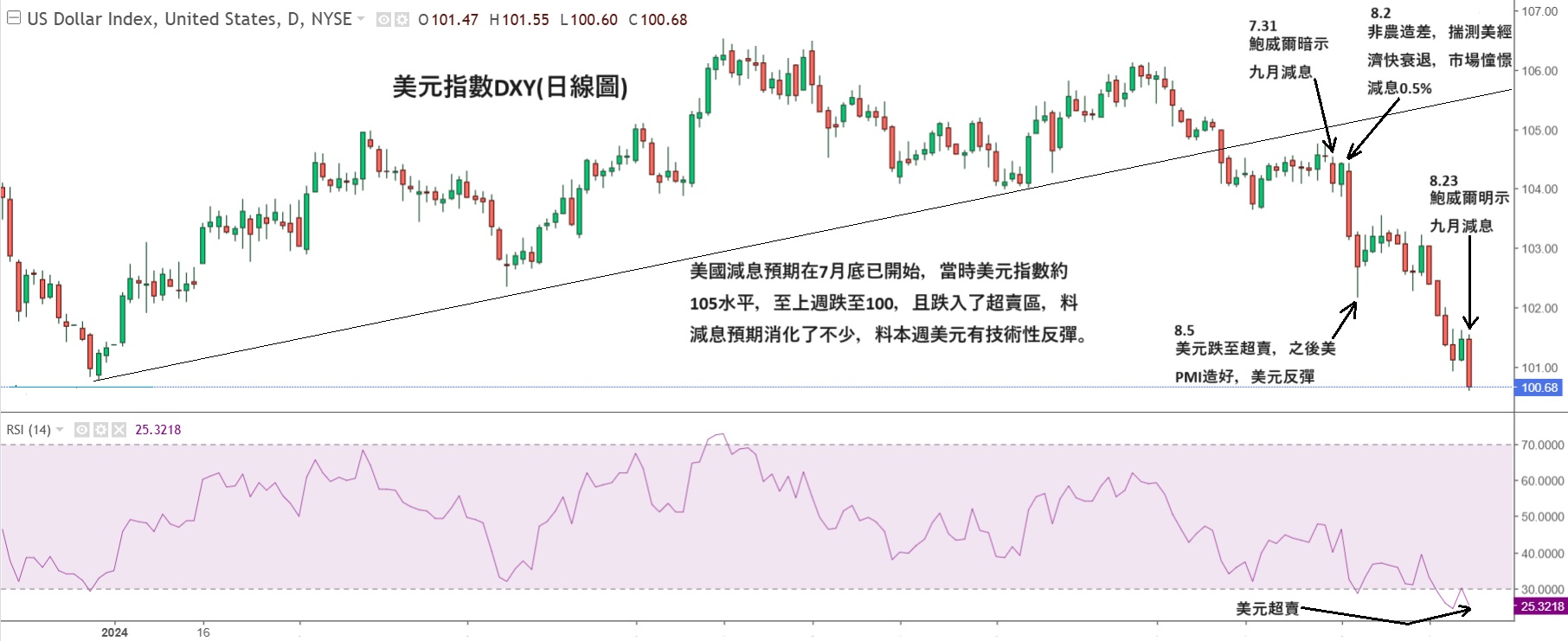 上周五晚(23日)联储局主席鲍威尔在怀俄明州举行的全球央行年会中,再次向市场放鸽,他表示「九月将是减息时机」,相比7月31日议息时表示「减息将放在九月议息议程中」,周五晚的言论更确定了九月会减息,不过并没暗示减0.25%还是减0.5%,鲍威尔过去两年多以来首次向市场明确地放出减息讯息,令周五晚美股上扬,美元显著下跌,但是,9月减息预期已在7月底开始炒,美元亦下跌了不少,仍有空间下跌?