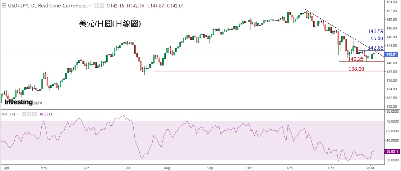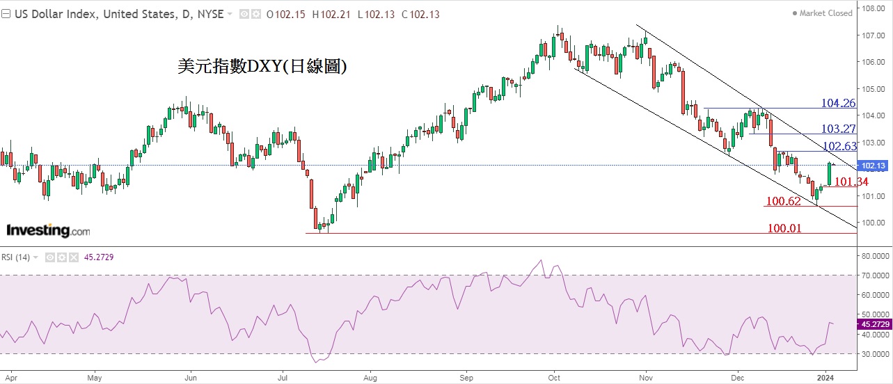 下方是美元指数DXY(日线图),过去3周市场因炒联储局将在3月展开减息周期,令美元一直下滑,至上周美元指数下跌至100.62,跌至RSI 30超卖区随后作技术反弹至今,预计美元将继续缓慢地反弹至周五美国公布「非农」前。值得留意,是上方102.63是重要阻力,因位置处于下降信道的顶部阻力,若升破美元会进一步反弹,但只属短期上升,不改变美元长线看跌的看法。