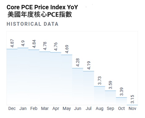 然后到周五(26日)美国将公布12月核心PCE(扣除食品及能源)个人消费支出,这数据是联储局最首选的通胀指标,比CPI更重视。12月核心PCE预测是3%,11月是3.2%。虽然12月CPI略有回升,但不代表12月核心PCE会跟随上升,若然今次核心PCE结果符合预测,反映反映通胀回落,也会提升3月减息的预期,令美元下跌,因为,见下图,核心PCE从去年1月至今一直没有反弹下回落,反映美国通胀持续下降,将加大联储局3月减息的信心。