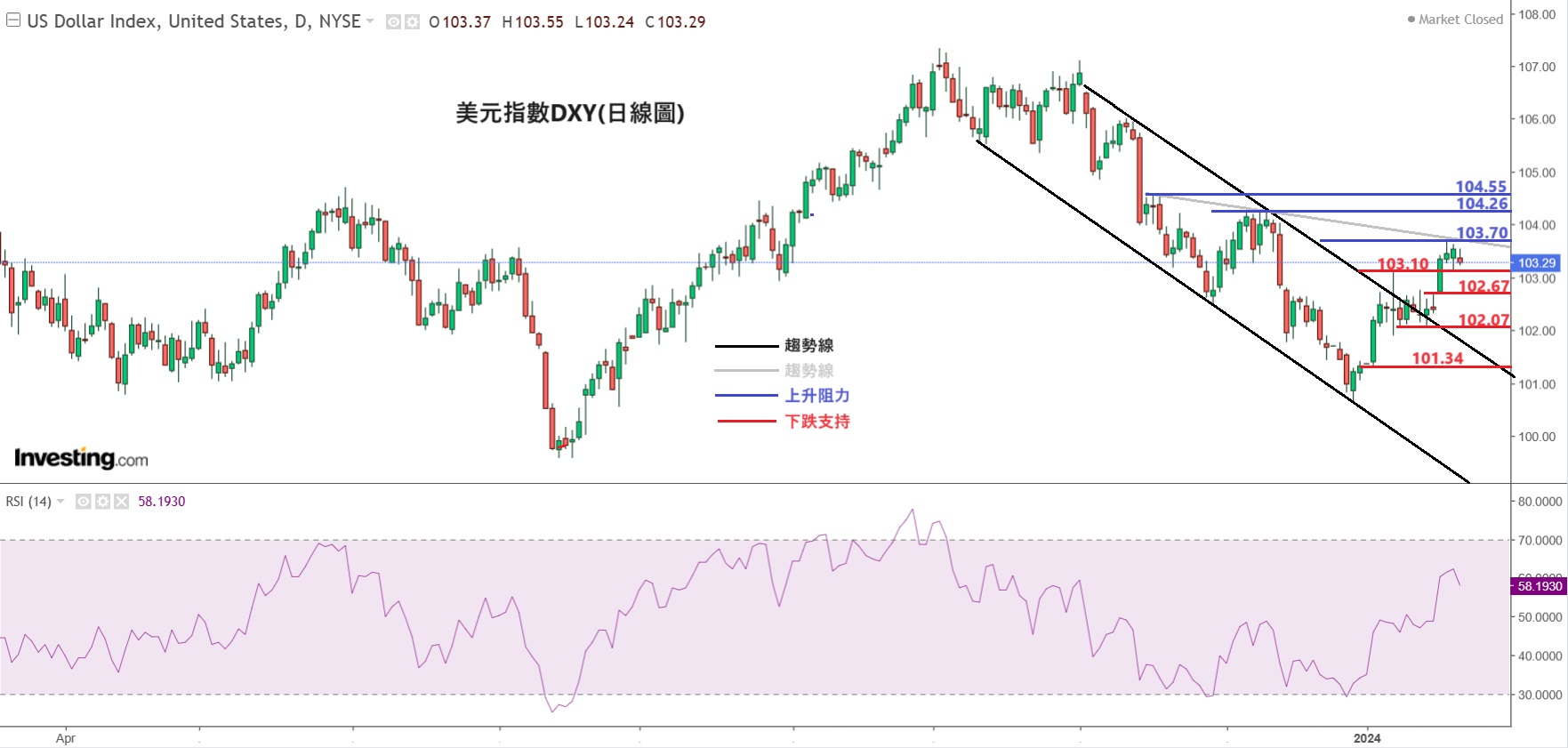 上述造好的经济数据,令3月减息机率从月初76%下降至上周五46.2%,因此推升了美元汇价,美元指数从1月初的101.38上升至上周最高见103.69,上周五晚收报103.29。