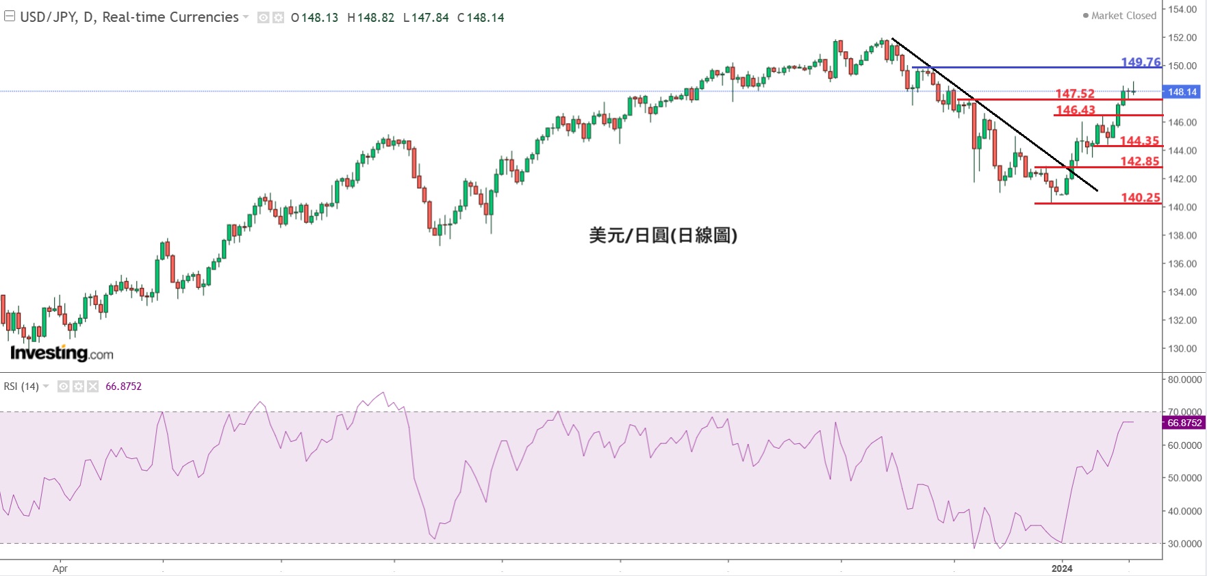 日圆汇价近期下跌主因是在1月公布的日本通胀结果下降及工资增长放缓,令3月日本央行结束负利率预期降温,加上美元反弹,导致日圆近日受到双重沽压,见下图,美元/日圆(日线图),从1月2日起日圆汇价从140水平下跌至上周五最低见148.82,周五收在148.14。但留意到上周末其RSI升近70水平,即美元接近超买及日圆超卖后,日圆跌势有所放缓,周五收市的阴阳烛出现了向下「十字星」形态,转势讯号,显示美元/日圆技术上或有回落迹象,即日圆汇价回升。本周二早上留意日本央行议息,市场普遍预计维持利率负0.1%不变,市场焦点集中在日本央行行长植田和男的会后声明,关注点在于3月18日议息对于结束负利率的取态。