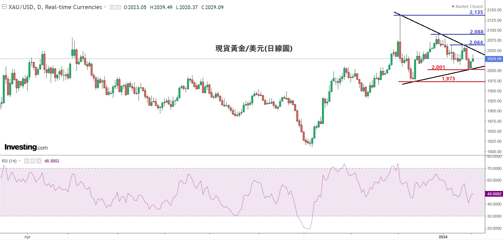 金价受到以巴战争在中东扩张,避险资金继续支持金价。早前战火蔓延到红海胡塞武装组织攻击商船,令美国空军4次发动空袭攻击胡塞武装在也门的据点。刚在周末,伊朗在叙利亚及巴基斯坦发动导弹袭击,旨在攻击支持以色列的武装组织。在完稿时(即周一凌晨时份),据报伊朗我革命卫队宣布与黎巴嫩真主党游击队将协助也门胡塞武装组织攻击红海商船,似乎中东局势紧张将持续,形势预计继续支持金价。
