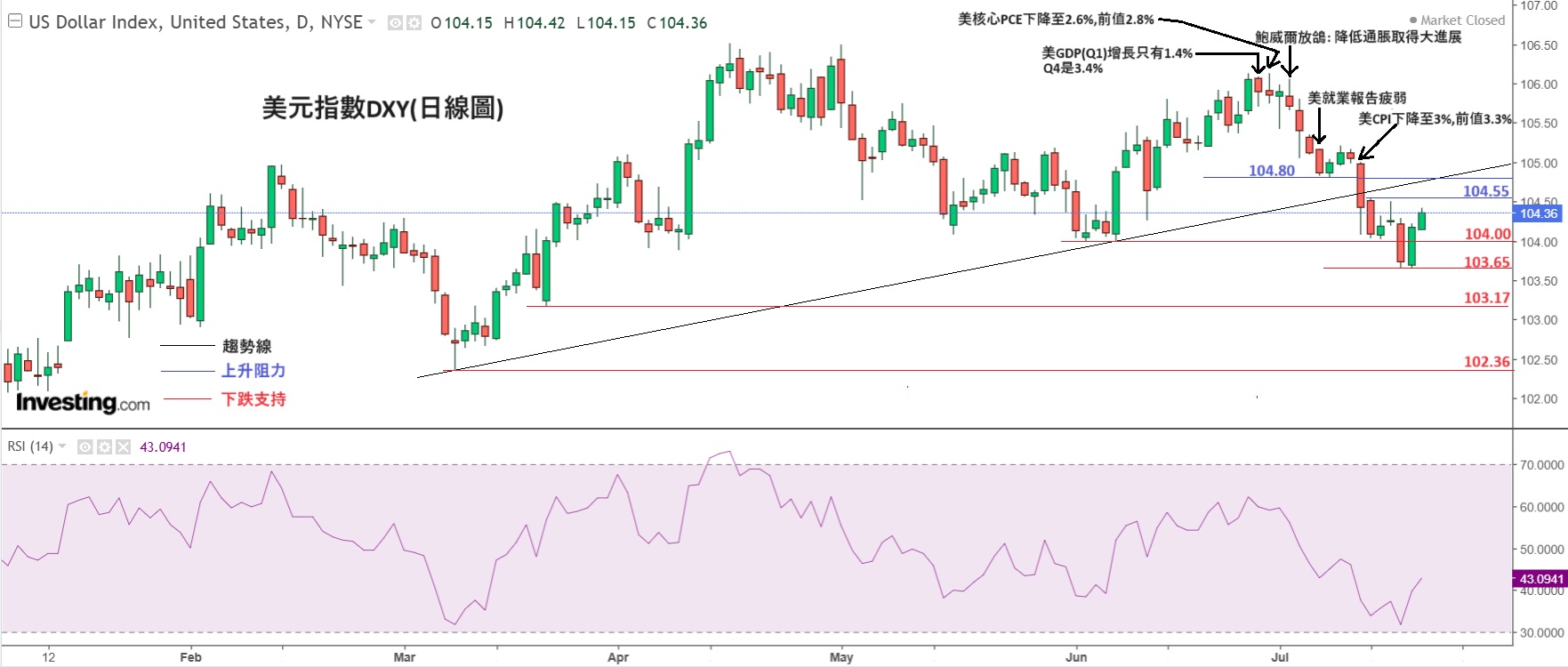 见下方图表,美元整体在七月是下跌,主因是7月公布的美国经济数据转弱及通胀数据下降,符合了提前减息条件,令九月减息0.25%机率上升,上周五收市后,九月减息机率更升至94%。所以美元会否继续下跌,本周美国公布的第二季GDP初值及核心按年PCE成为了重要焦点。