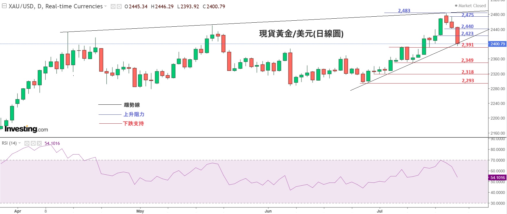 见下方图表,黄金上周三再创造了历史新高,现货黄金最高曾升至2483美元,技术上这价位刚好是上升趋势线(以黑线显示)的上升阻力线顶部,最后未能升破,随后周四及周五出现回落,周五收在2400美元,3日内黄金回吐了83美元。值得注意,周五晚金价收在2400美元,刚好收在上升趋势线的下跌支持线底部,暂时未能判断为跌穿,周一开盘后如果金价下跌,且跌破下方支持位2391美元,相信金价短期会继续下探。相反,如金价回升,这显示了支持线得到支持,金价将反弹。金价长线仍看涨,因为全球多处地缘政治风险仍在酝酿上升,美国减息周期也接近开始。