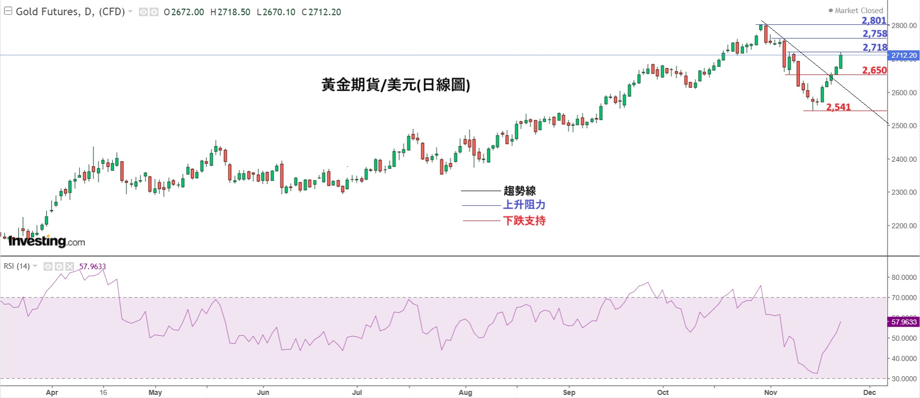 上周金价受到俄乌局势升级连升五日周三(20日)升破了下降趋势线后持续上升周五晚收在2712美元RSI 升至57中性水平尚未至超买反映金价仍有上升空但美元指数RSI已升至74属严重超买水平本周美元有可能回吐将带动金价持续上升有机会再挑战历史高位2801美元密切留意俄乌及中东局势进一步消息。