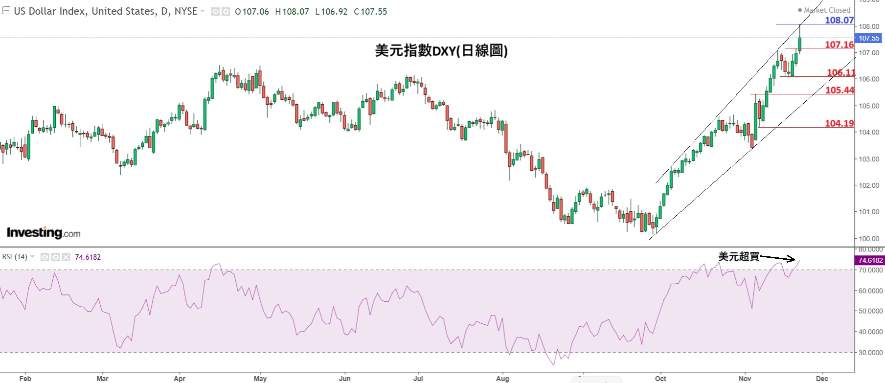 美元汇价从月初受到特朗普效应及鲍威尔放鹰刺激下持续上升上周五(22日)美元指数收在107.55创两年新高但其RSI 已升至74.6属严重超买水平因此预计本周美元将有技术性回吐意味住非美货有反弹可能。主要货币中欧元/美元最近跌幅最多其RSI 上周五跌至26属严重超卖水平因此料欧元是非美货币中将有最强反弹。