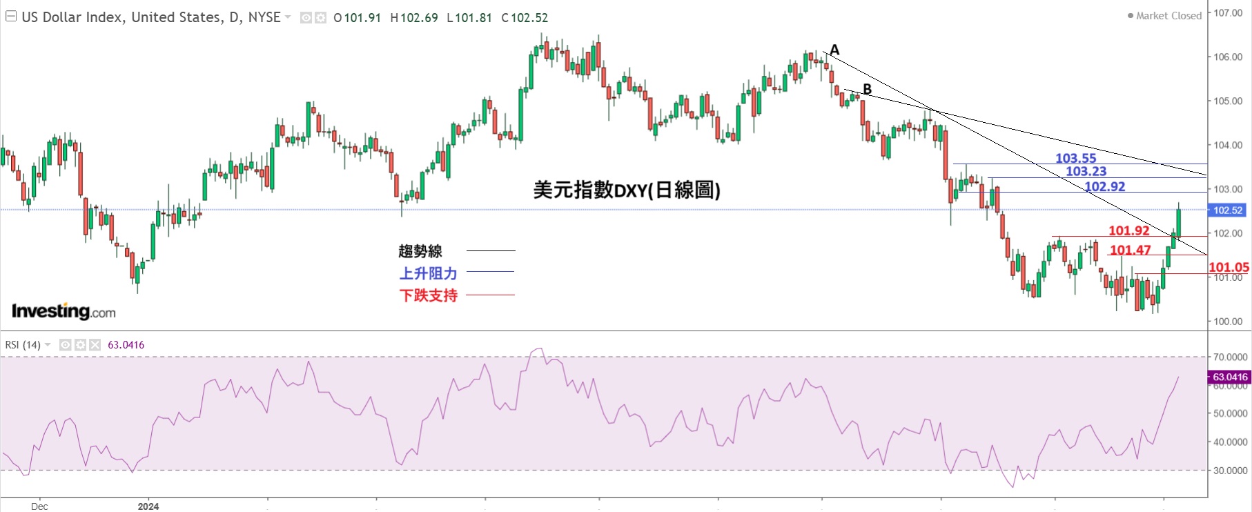 技术分析方面,美元指数在上周五晚升破了下降趋势线A,预计本周持续上升,可能上试下降趋势线B, 重要上升阻力是103.55,也是下降趋势线B的位置。
