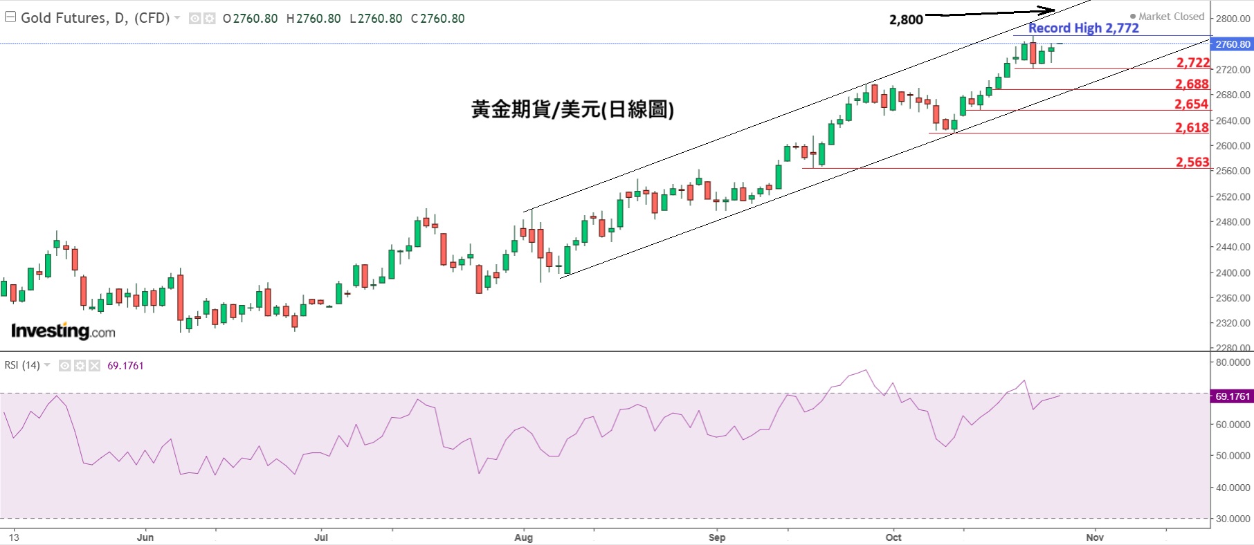 自8月中起,以色列与伊朗多次轮流袭击对方,导致中东局势不断升级,避险情绪令金价不断创新高,上周三(23日)再创下最新的历史新高2772美元,目前上升通道顶部2800美元(以黑线显示)为短期上升阻力,上周五(25日)收市报2760美元,仍收在偏高水平。