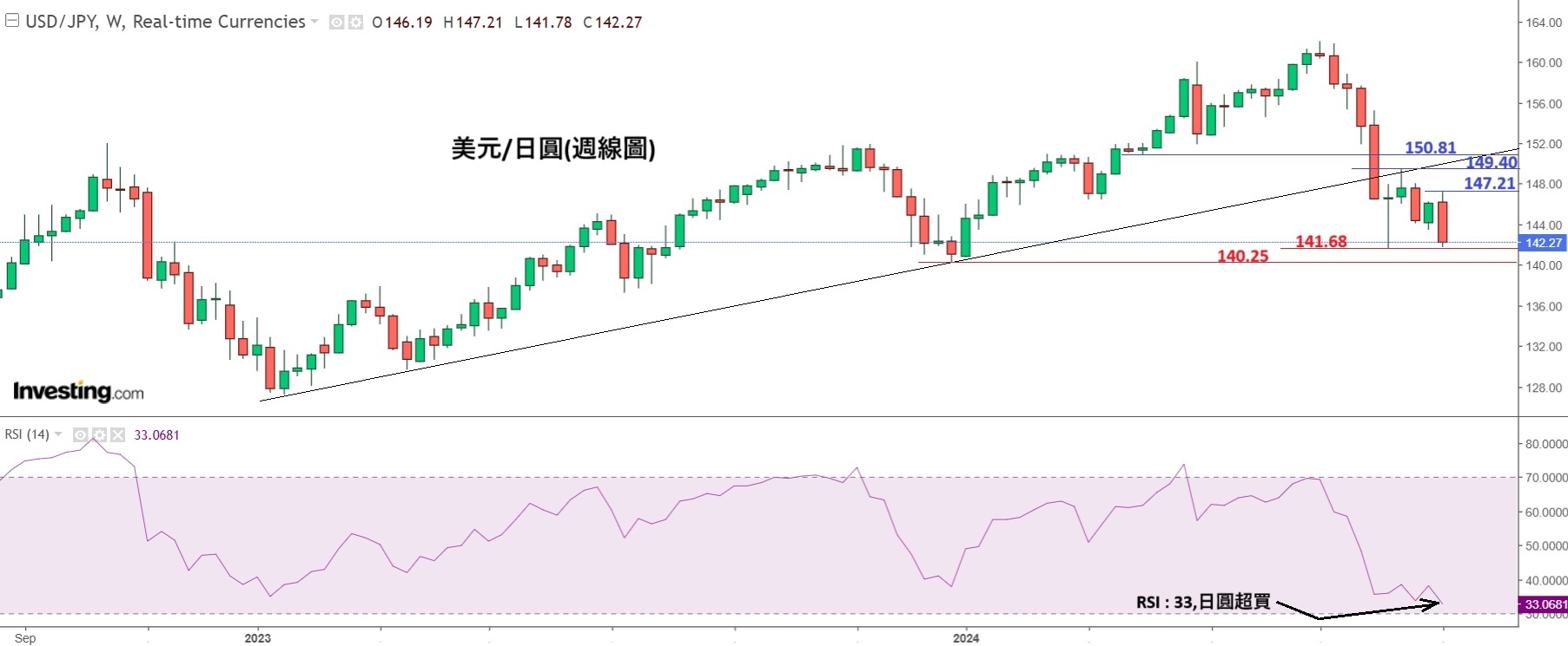 上周五晚出现了「日圆拆仓」令日圆上升。事缘是上周四(5日)日本央行委员高田创表示,通胀如果按预期地上升,日本央行有必要再加息及再收紧目前的宽松货币政策。日本央行放鹰,市场担忧下周五(20日)议息日再加息,加上周五晚美国就业报告表现一般,加强了下周联储局减息预期,市场出现了「日圆拆仓」效应令日圆汇价上升,美元/日圆周五晚收市报142.27。不过,请参考下图,日圆已升近超买水平,虽然日圆汇价长线而言是看涨,但由于近日升至超买,所以日圆汇价本周再升值空间料有限,预计本周会回落至水平。
