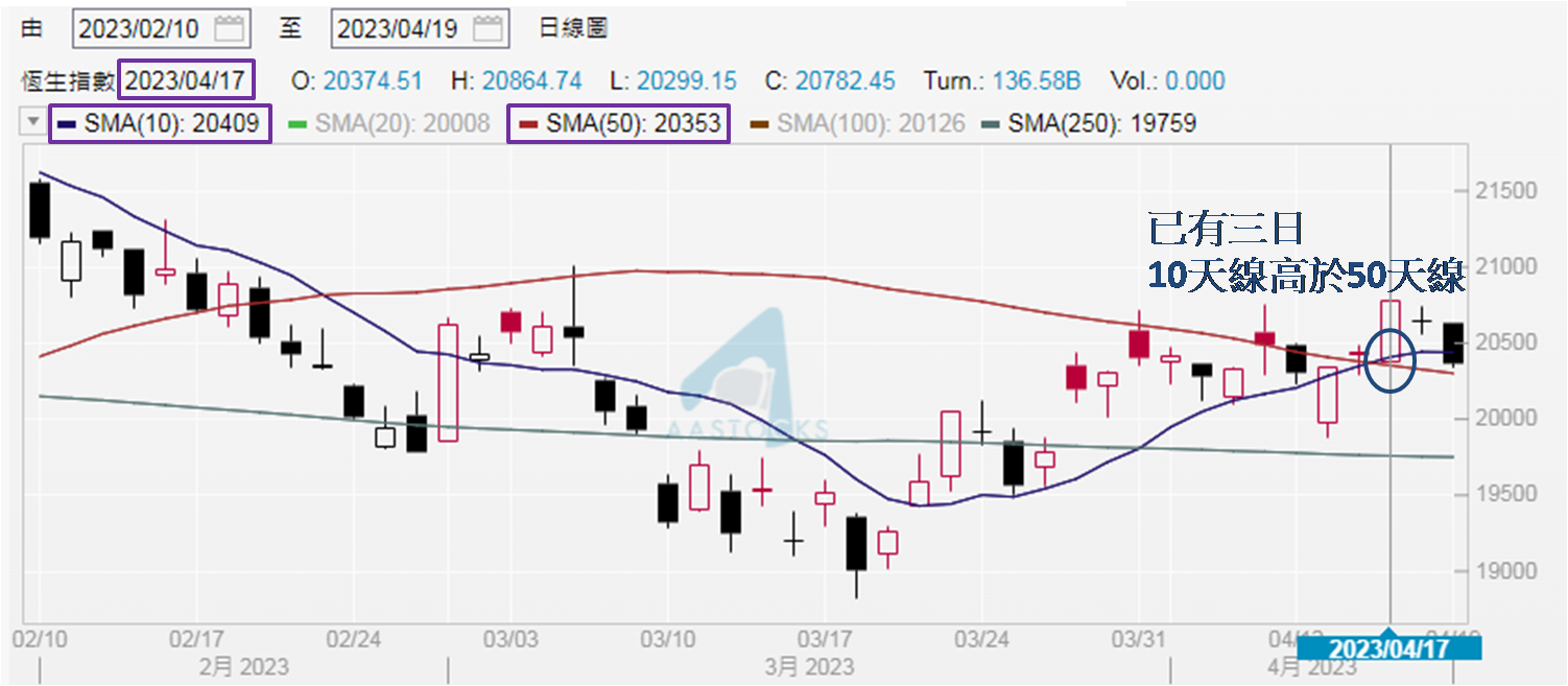 另一参考是10天和50天线的互动,于4月17日起上破50天线,快线升穿慢线属利好讯号,截至4月19日已是三日处于50天线之上 (如下图),两线差距分别是56、116和138点,有扩大迹象,支持利好后市的立论。但也不是毫无隐忧,昨日恒指收低于10天线,是3月22日以来首度出现,事隔接近一个月见回软。此外,4月18和19日见10天线分别在20,443和20,439点,正酝酿下移,倘若恒指续跌,10天线下移速度将加快,不久会见10天线跌破50天线,便由现时的利好讯号,转为利淡讯号。