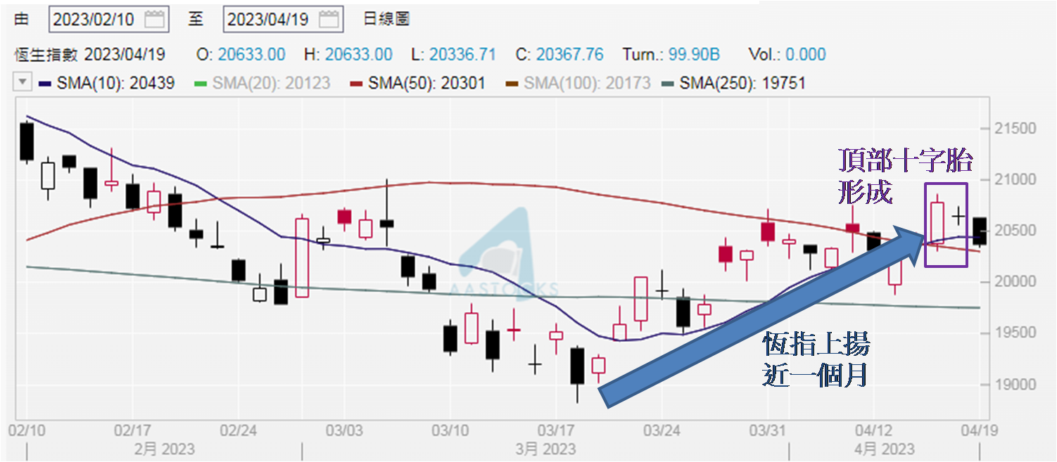 一般历时超过两周,视为升势已持续一段日子 (如下图),及后见阴阳烛利淡形态参考性较高。4月17日恒指收市位和开市位为20,782和20,374点,相距超过400点,产生较长的烛身,配合当日高位和低位为20,864和20,299点,亦产生上、下影线,形成上下影线阳烛,属强势阳烛的一种,解读为买方动力较强,理应预示升势会持续。不过4月18日见收市位和开市位为20,650和20,643点,相距少于10点近乎烛身「缺席」,形成「十字星」,属好淡争持形态。由买方强势转为买卖双方在拉锯,证明早前买方优势经已消失。
