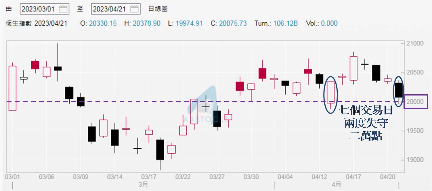由4月13日计起,现为第二度低位失守20,000点 (如下图),值得留意4月13和21日恒指走势截然不同,前者是为低开高走的阳烛,并录得升市。当日开市位和收市位为19,977和20,344点,为上行近370点的烛身,产生长阳烛,反映买方动力较强,预示后市续升,结果之后两个交易日的确再升,并于4月17日大升逾340点,收报20,782点,创2月21日以来收市新高。回看如今,最近四日 (4月18至21日) 其中三日见跌,累跌逾700点,配合4月19和21日恒指都见低走,烛身均超过250点,产生长阴烛。