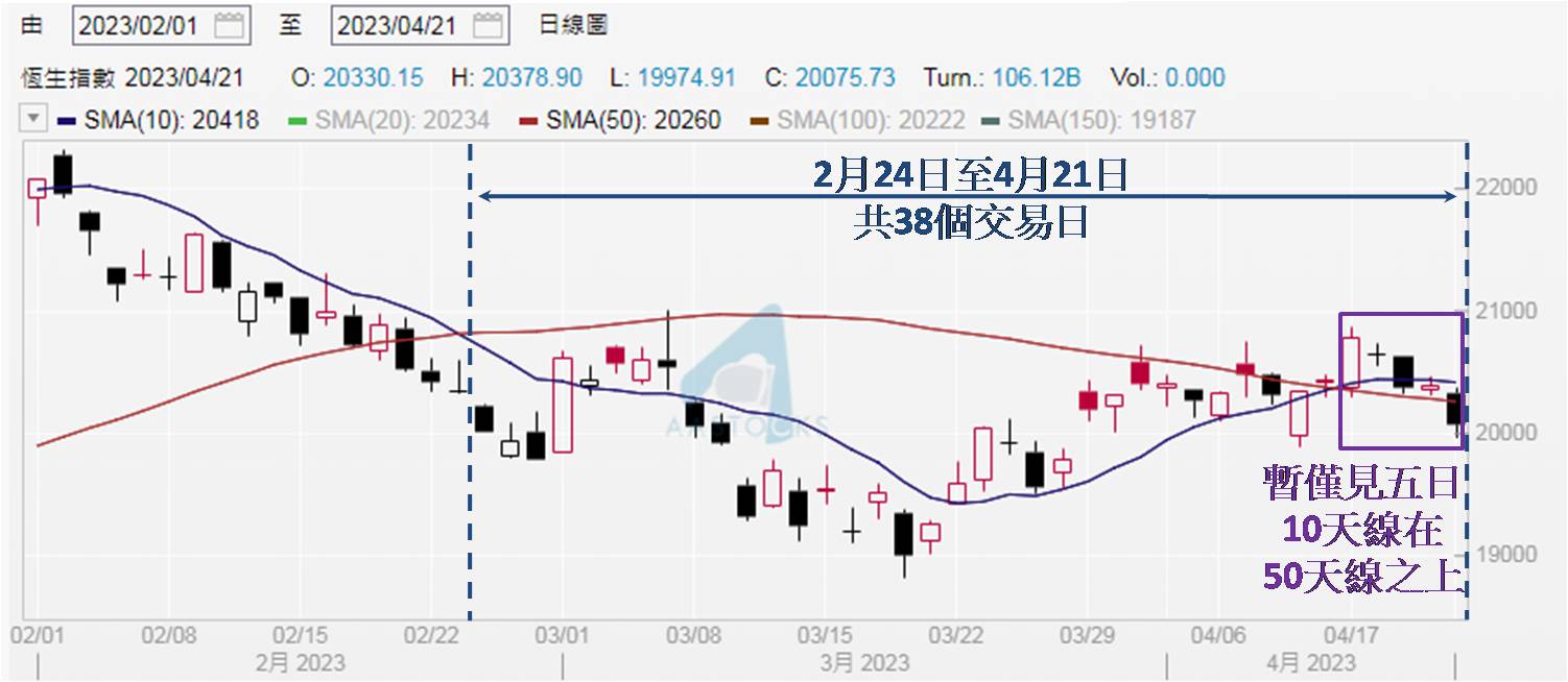 其实自2月24日为上回跌破50天线至今,历时接近两个月 (共38个交易日),期内只有4月17至21日五个交易日见10天线在50天线之上 (如下图),占当中的日子还不到一成半,反映在普遍日子10天线受制于50天线,故于上次市评文章在标题上已表示要关注恒指能否守住20,300点。前文末指出参考4月13日收报20,344点及50天线处于20,301点,反映若见连续两天收低于20,300点,确认恒指仍要下行,20,000点心理关口未必能守住。当然,此心理关口今次不属技术走势的支持位,19,800点才是。