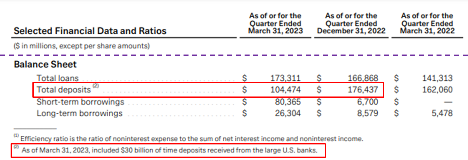 距离本月完结余下两个交易日,关注恒指与250天移动平均线的互动,于3月29日至4月24日均收高于此线,4月25日却见失守,昨日恒指收报19,757点,较250天线处于19,726点,轻微高约30点,所以能否继续收高于此线仍有变数。3月曾掀市场关注的美国银行业资金缺口问题,近日见新消息,按去年资产总额计算,美国第14大的第一共和银行 (FRC.US) 公布今年首季业绩显示,截至3月底总存款降至约1,045亿美元,较去年12月底约1,765亿美元 (如下图),按季大减逾四成,单是3月已流失逾千亿美元存款。
