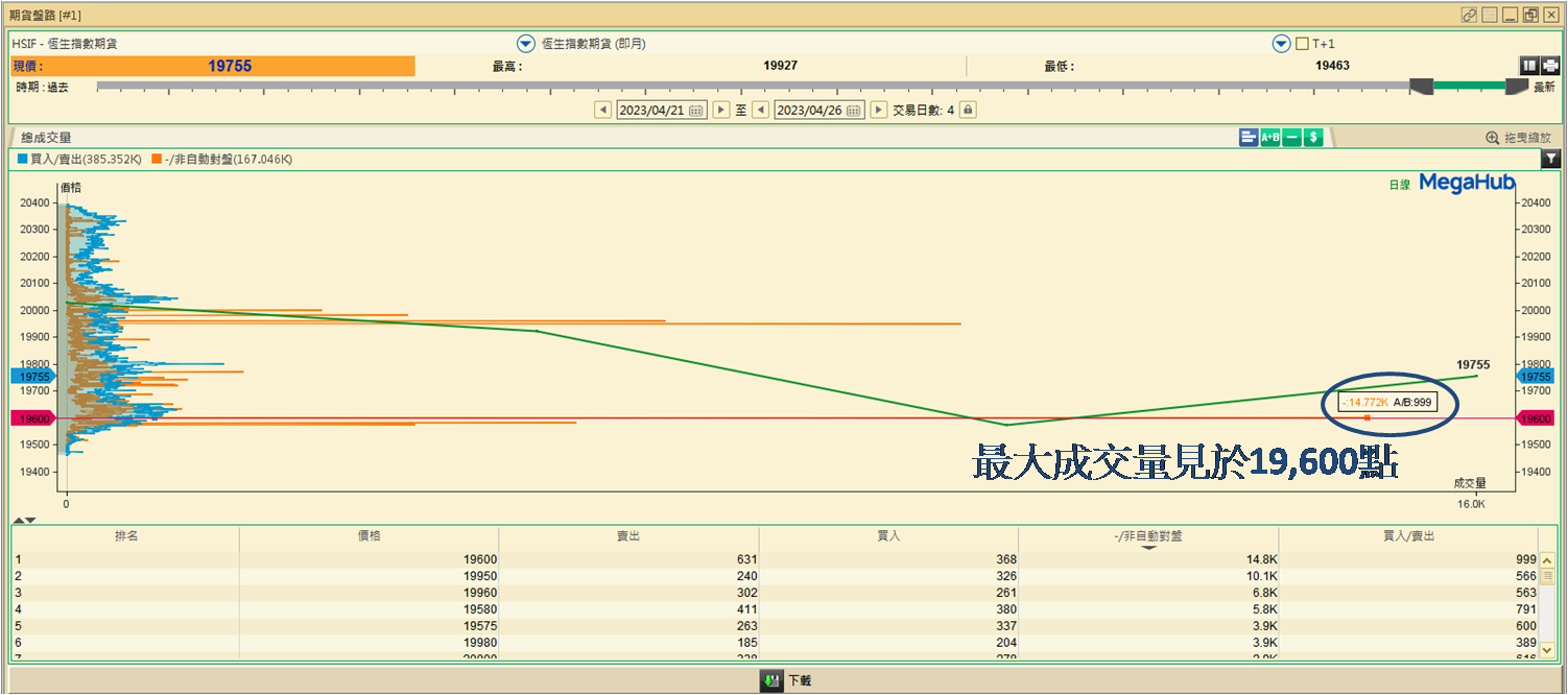 至于下月期指 (5月期指) 见4月21至26日的成交分布,有三个成交密集区,为19,600至19,650、19,798至19,809和20,028至20,051点,相对平均成交位置为19,621、19,803和20,040点,而5月期指昨收19,707点,较19,803和20,040点为低,理应得出大户已建淡仓的结论。不过多达15,771张合约成交位置在19,600点 (如下图),而上述四个交易日累计成交约55万张合约,分布于923个期指位置,即每个位置平均值为598张,所以15,771张是多出超过25倍,值得关注。上述的19,600点较19,707点低逾100点,故此仍要观察今日的5月期指是否收低于19,600点,方可确认大户已建淡仓。否则,适宜多看两至三个交易日,要是依然在19,600点之上,视为大户已建好仓的机会较大。
