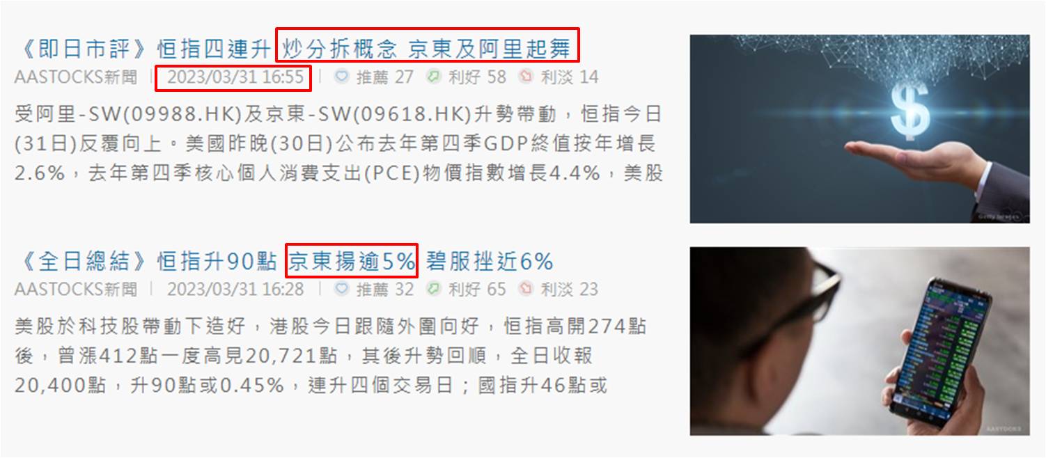 继上周三 (3月29日) 阿里巴巴─SW (9988) 的集团架构重组消息,被视为有助集团整体价值显著释放,刺激股价当日大升至一成二;周五 (3月31日) 又有京东集团─SW (9618) 向港交所递交上市申请消息,京东产发和京东工业可望在上半年完成分拆上市,带动股价当日一度升逾8.00%,最终仍升近5.40%收市 (如下图),回到3月上旬水平。大型科技股连翻见好消息,虽未算是3月30日发布市评文章于末部表示出现重大利好消息;但已令港股投资气氛回暖,过去三个交易日大市成交金额均逾1,300亿港元,若以周计算,为过去十周新高。