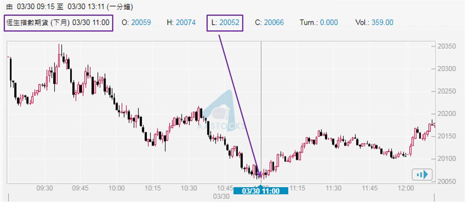 现属4月开局,值得与大家探讨期指大户部署,前者透过截至3月29日下午4:30,3月和4月期指分别收报20,223和20,290点,后者高出近70点。于期指操作逻辑,于20,223点建好仓,较于20,290点有利;意味着4月期指的位置反而建淡仓较有利。回顾3月30日的期指走势,已见微妙变化,于上午9:36见4月期指高位在20,355点,较20,290点仅高出65点,却已是开市以来高位,继而期指下行,至上午11:00低见20,052点 (如下图),倒跌238点。同一时间3月期指低见20,043点,即20,052点高出不足10点,与上述高出近70点有明显分别。