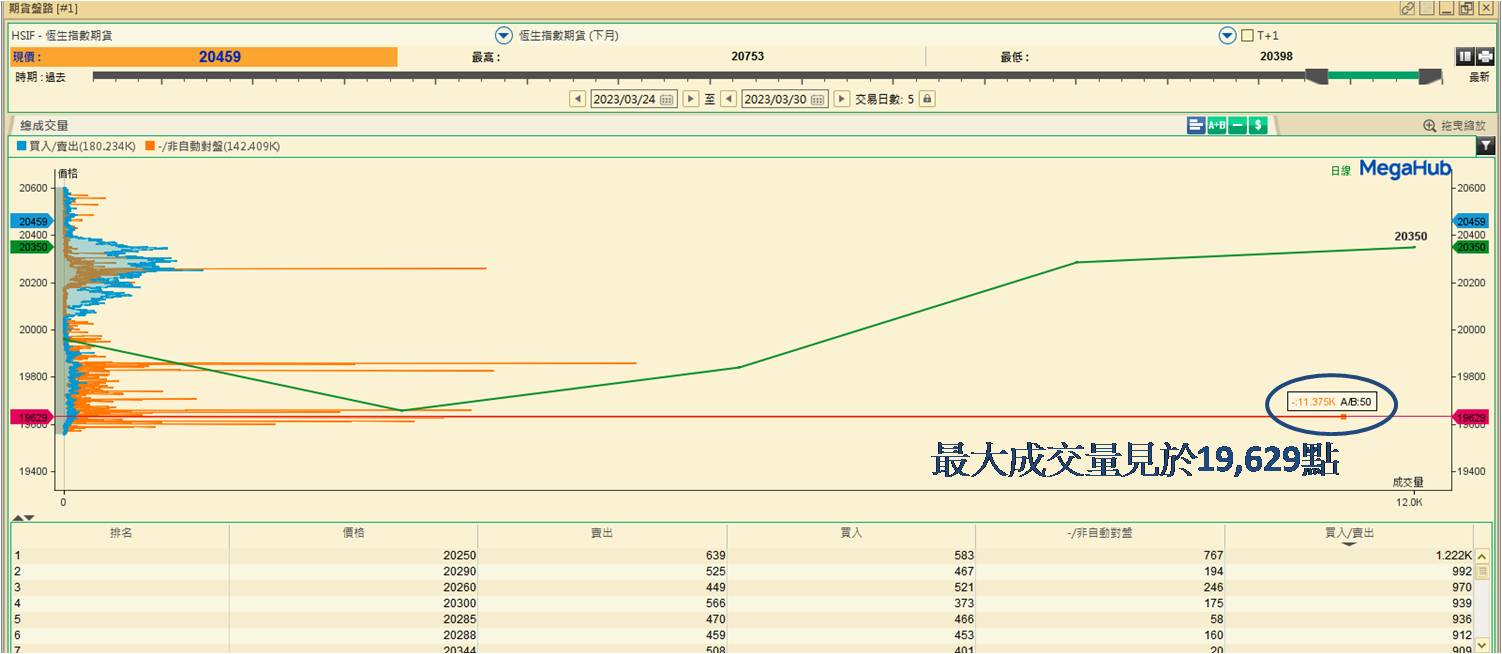 期内共五个交易日,累计成交322,643张合约,期指位置介乎19,629至20,033点,涉及1,043个位置。而于20,242至20,303点涉及62个交易位置,占1,043个的5.94%;合共交易66,777张合约,占总数322,643张的20.70%。不足6.00%的交易位置却已涵盖成交量逾1/5,明显大户于此范围部署4月期指仓位。该密集区的平均成交位置在20,270点,至于3月30日收报20,350点高出80点。表示看来差距不大,未能确认大户已建好仓。但要知道成交量最大的两个位置为19,629 (如下图) 和19,857点,都不在上述范围,相对成交量为11,425和5,169张合约。