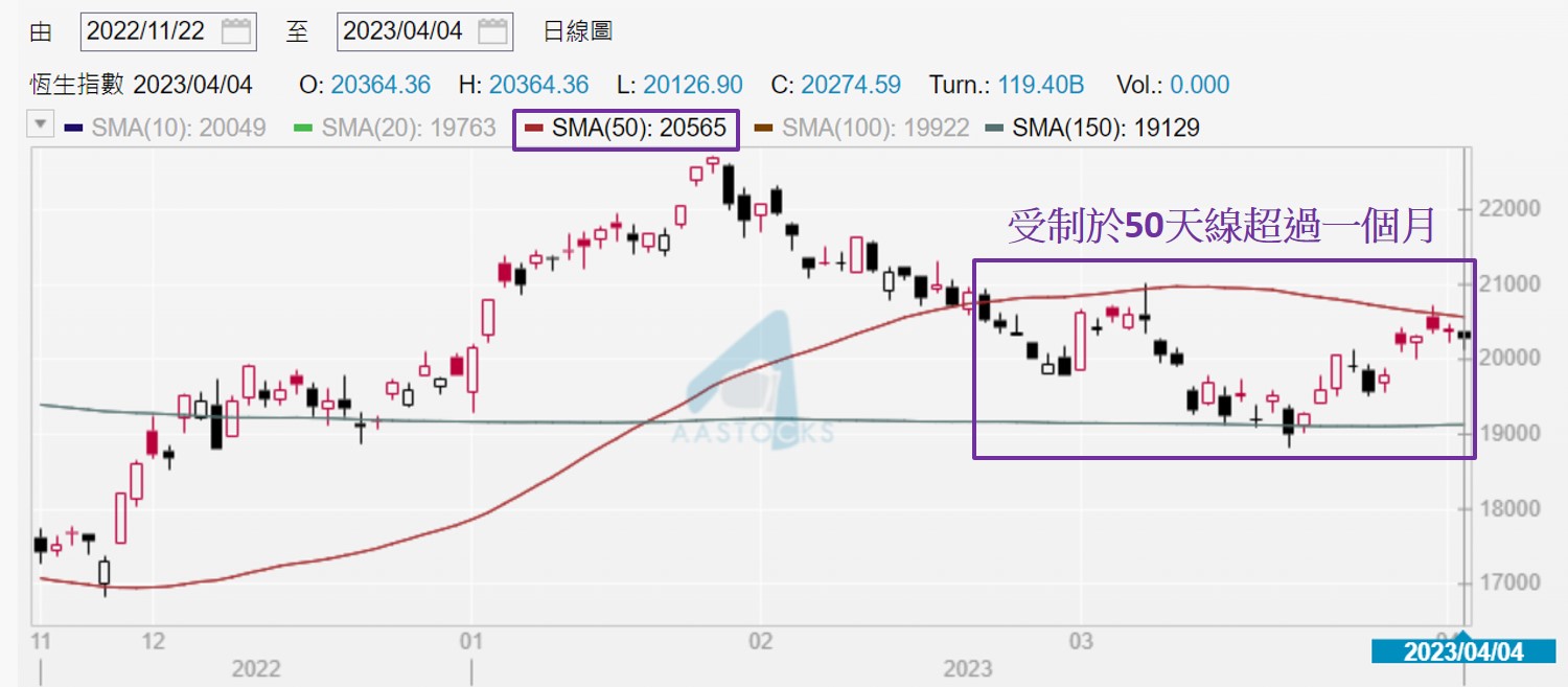 恒指虽见跌,却仍收高于20,000点,经已连续五日如此,理应视为已企稳在20,000点心理关口之上。不过现较此关口高出不足500点,倘于复活节假期A股依然在交易期间出现负面消息,下周二港股复市便要受压,所以后市走向仍要观望。现应关注恒指处于两条重要的移动平均线之间,分别是50天和250天线。两条的重要性在于50天线属短周期平均线代表,250天线则是长周期平均线代表。自3月29日起收高于250天线,暂于长周期来说后市倾向利好。不过自2月21日起,历时超过一个月,恒指受制于50天线 (如下图),短周期见偏淡。