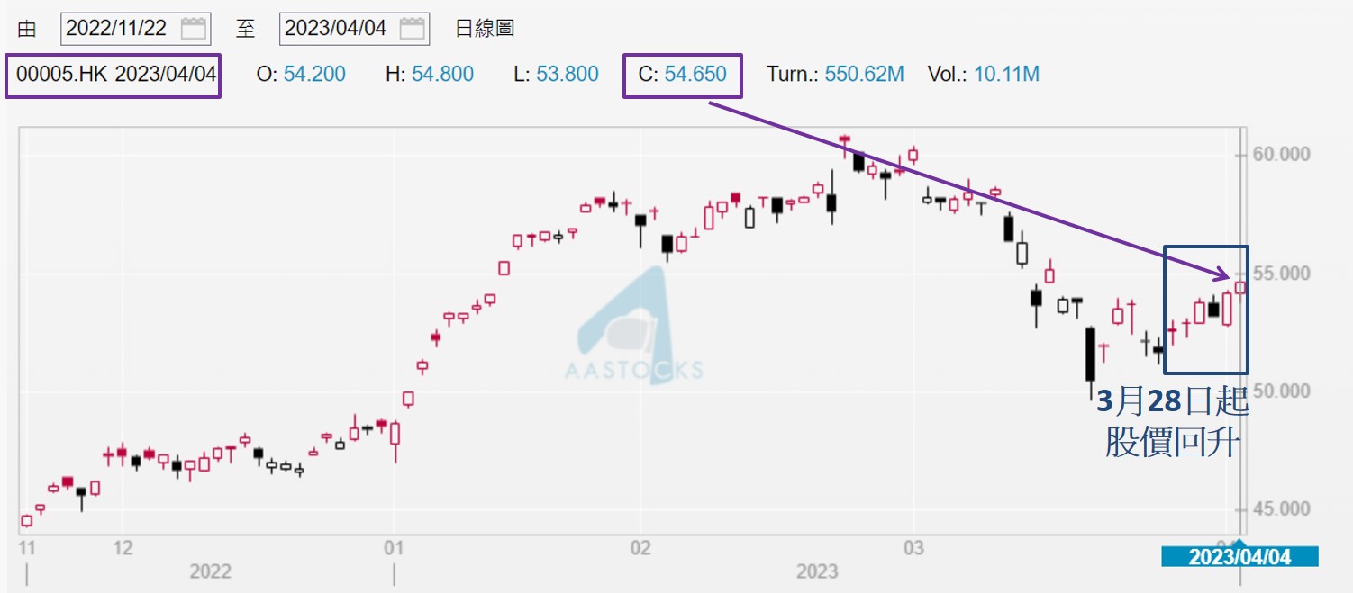 这意味着美国上市的金融股,尤其是银行股有不少仍较3月上旬水平显著为低,吸引资金涌入。相信在港上市的国际银行股和本地银行股表现也会受惠,有望带动恒指于本月上破50天线。现为恒指五大权重股之一的汇丰控股 (0005) 自3月28日起经已渐见回升 (如下图),由3月27日收报51.65元,相对4月4日收报54.65元,累升5.82%。不过仍较3月9日 (美国硅谷银行暴跌前夕) 收报58.55元低6.66%,推断股价依然有上升空间,已持货者不妨多观望两至三个交易日,未见汇控收高于55.00元,才考虑离场。但有意进场者则要三思,就算汇控真的有力升至58.55元,较现价之潜在升幅明显不足一成,故此未见股价处于53.20元或以下,进场诱因不大。