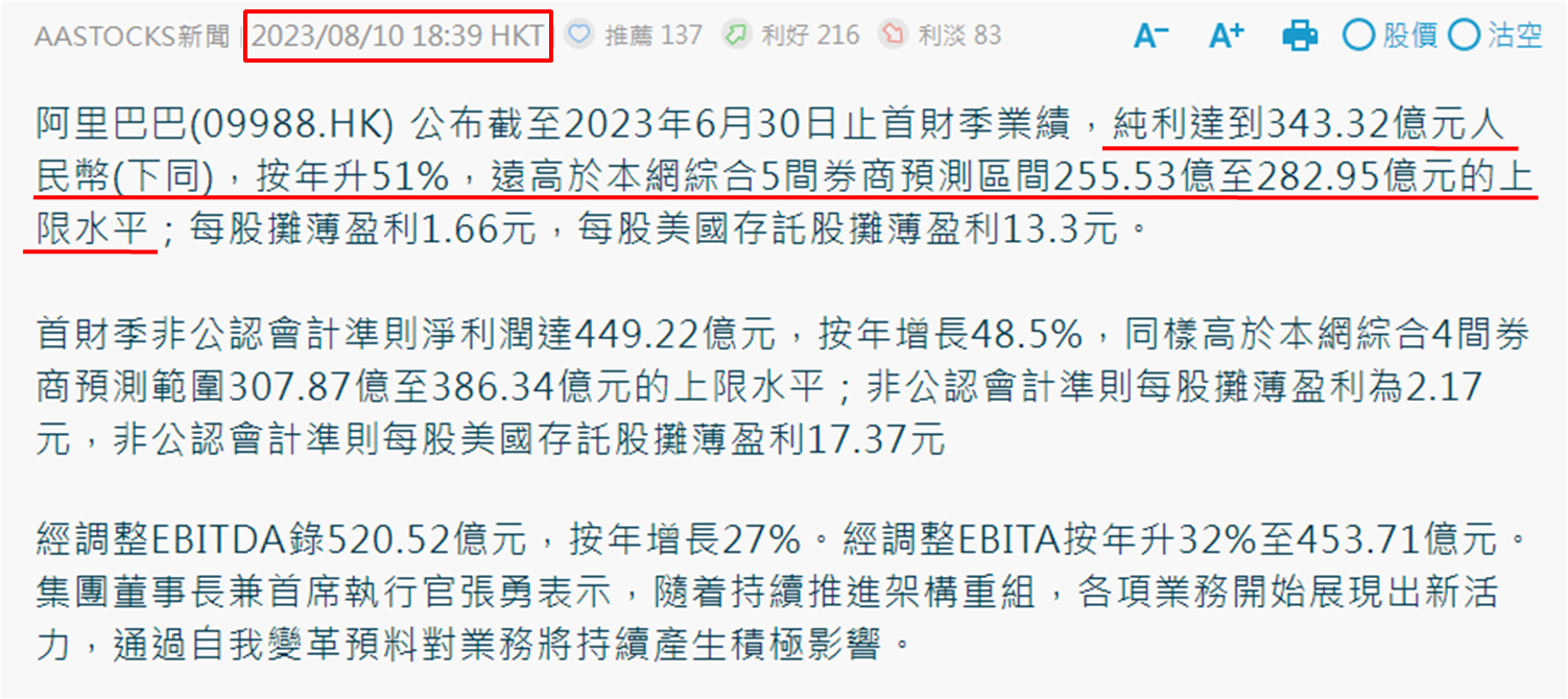 前文亦指出8月10日阿里巴巴─SW (9988) 公布2023/24财政年度首季业绩,考虑到此乃恒指五大权重股之一,若业绩胜预期有助恒指造好。当日傍晚公布业绩,截至2023年6月底的三个月股东应占溢利达到343.32亿元人民币 (同比增长近51.00%),绩前市场预测介乎255.53亿至282.95亿元 (如下图),较预期上限仍高出超过21.00%,可见季度业绩令市场有惊喜。紧接在美国交易的ADS折合收报96.73港元,较8月10日港股收报94.30元,高出接近2.60%。周五港股也见高开逾3.00%,报97.15元,并且开市不足20分钟高见97.95元,升幅扩大至3.87%。