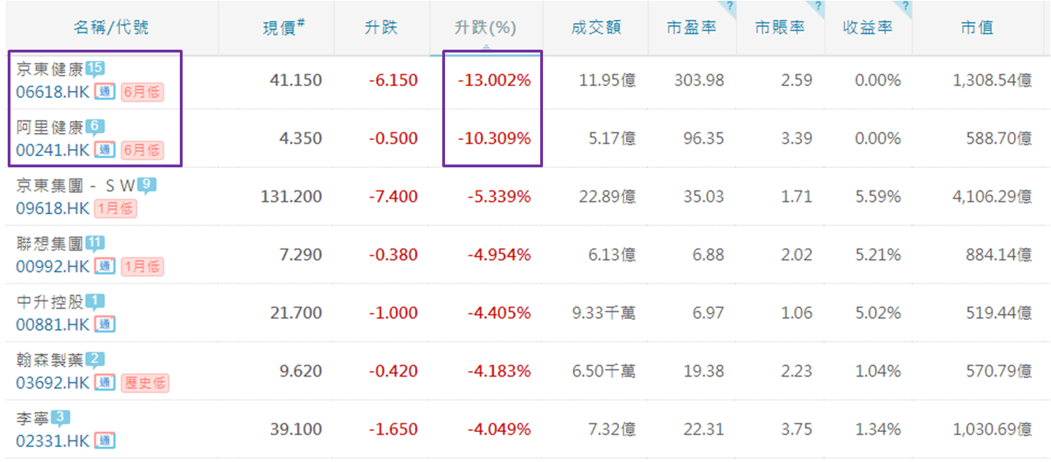 京东健康 (6618) 和阿里健康 (0241) 分别下跌13.00%和10.31%,为上周五表现最差两只蓝筹股,消息面见上周四 (8月17日) 内地最高人民检察院发文表示,将开展食品药品安全领域「网络直播营销」专项监督活动,助推网络直播营销健康有序发展。此前监管部门持续多次重磅发声,直指医药行业腐败问题;早于7月28日,纪检监察机关配合开展全国医药领域腐败问题集中整治工作动员部署视频会议在北京召开。对于医药板块行业整顿,早前在市评文章已略谈,当时消息令医药蓝筹股中国石药 (1093)、中生制药 (1177) 和翰森制药 (3692) 同见下挫。