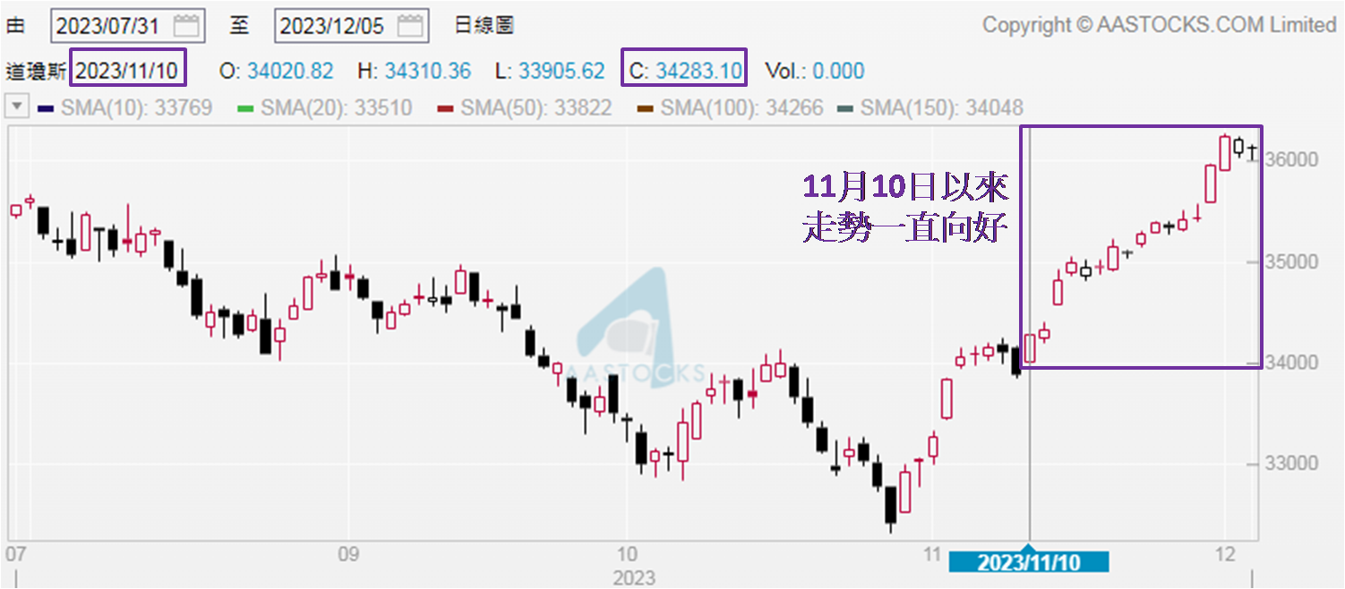 虽见低开15点后跌幅扩大,开市首分钟低见16,234点,下跌93点,已是全日低位,不足十分钟经已由跌转升,上午收报16,447点,倒升近120点。下午开市升势持续,开市半小时报16,554点,升幅扩大至近230点,之后徘徊于16,500点附近,全日收报16,463点。不过仅升一日未能确认港股已摆脱跌势,现有两种有力转升的参考,其一是上述上升裂口,顶部见于去年11月11日低位16,829点 (如下图),收高于此完成回补裂口。其二是三连跌前于11月30日收报17,042点,而10天移动平均线更于17,050点之上,留意短期能否收高于17,000点。