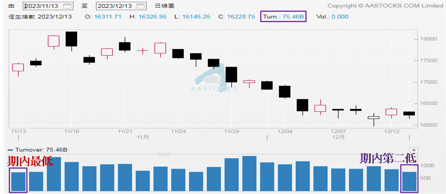 12月13日录得金额约755亿元,为11月13日至今第二低,较最低约752亿元 (见于11月13日) 只差约2,700万元,无异于现处一个月低水平。港股既乏力上扬,亦未见足够动力压穿16,138点,于是在上述裂口的数百点内摆动,未见明确方向。前文已表示恒指要是未能重上16,800点之上 (以收市位为准),成功完成回补裂口,恒指只会是「上落市」格局。至于交投偏静,亦与外围其他主要股市造好有关,美股道指于12月12日收报36,577点,较去年1月4日历史最高收报36,799点,相距不足0.61%。