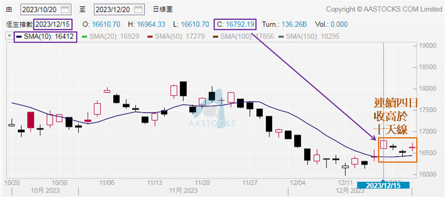 港股表现虽暂见胶着状态,但可留意最近四个交易日收市位,是期内最高四日的,也均在10天移动平均在线,恒指有上移迹象,所以早前或见失守16,000点而继续寻底的忧虑可释除。年底前应关注能否企稳在16,800点之上「收炉」,成事代表完成回补上述裂口,届时恒指上望17,300至17,500点。大家或有疑问为何突破16,800点后,不是看17,000点,而是17,300点。我们在参考的裂口见于去年11月,11月11日收报17,325点,由当日截至月底,最低收报17,297点,见于11月28日,17,300点在这两收市位之间。