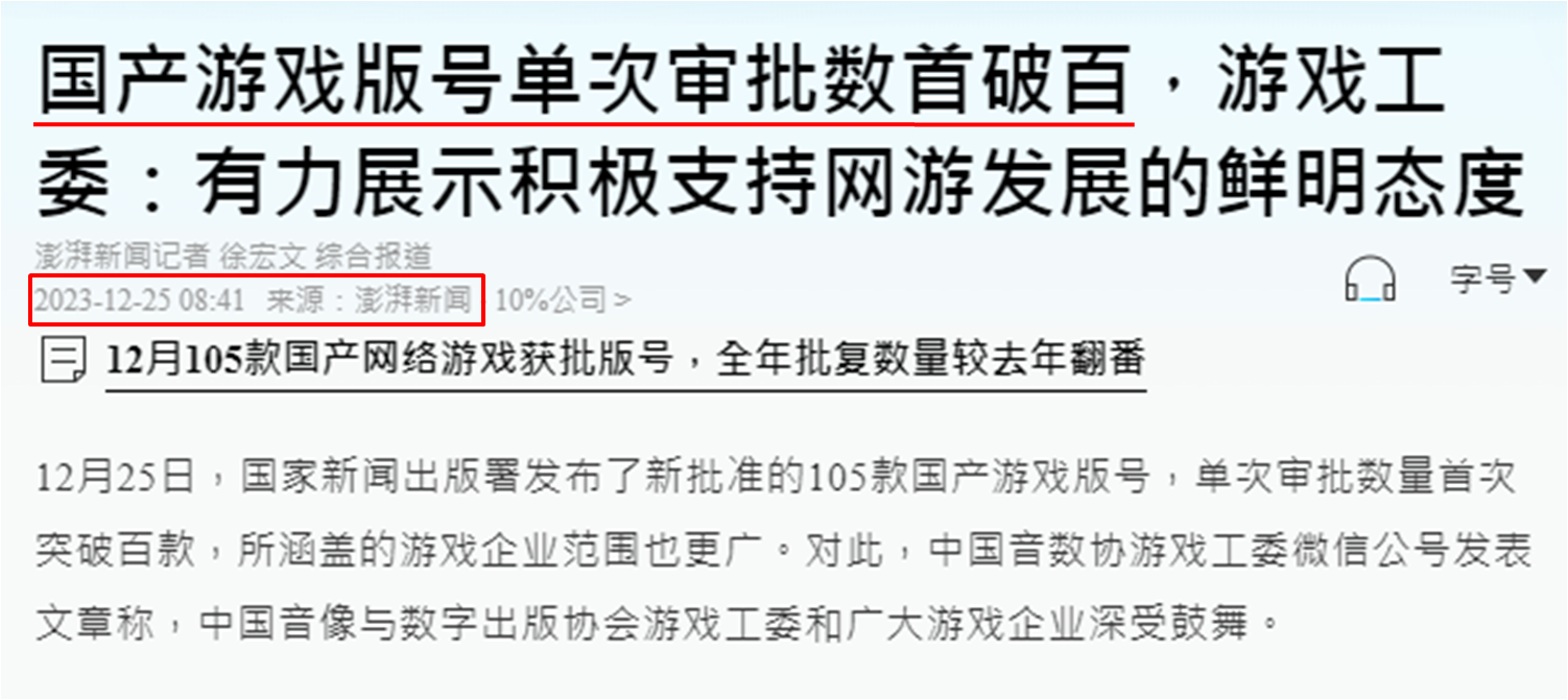另一内媒《澎湃新闻》引述一家游戏公司高管表示,「不得设置每日登录」这样的规定对网络游戏营运影响不大;但值得关注的是限制充值的条款,这里并未标记是仅面向未成年人,那么大概也会对成年人充值形成限制。意见发布后有分析指游戏收入占总收入分别是网易约70%和腾讯约30%,股价急泻的市场反应,不仅是中国政府提案的风险,而且与由于未来监管风险增加而导致投资评级或遭下降有关。在负面消息下,行业不乏正面消息,游戏工委于12月25日在官微发文,日内,国家新闻出版署发布了新批准的105款国产游戏版号,单次审批数量首次突破百款 (如下图)。