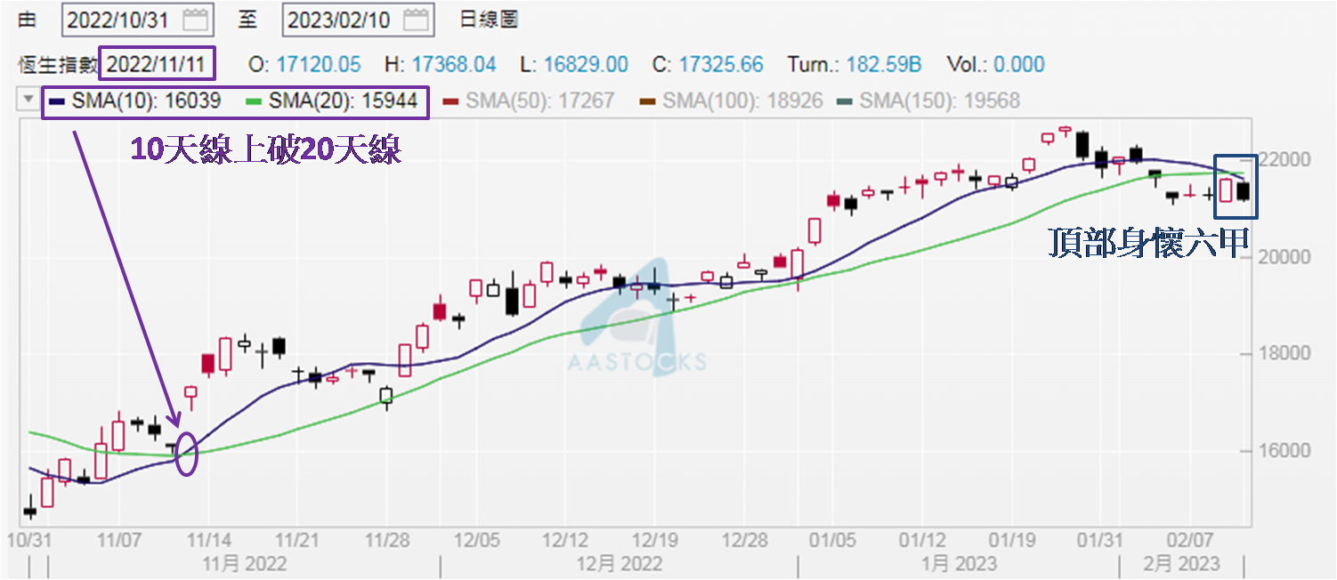 上周五10天线跌穿20天线,为2022年11月11日 (如下图) 以来10天线首度处于20天线之下。回顾港股最近一次升浪开端见于11月1日,相对11月11日只差八个交易日,代表升浪出现不久10天线便上破20天线。截至今年2月9日,10天线在上历时长近三个月,随着两线位置逆转,投资者要关注港股今次升浪是否告一段落。倘若今、明两日 (2月13及14日) 同见10天线在下,投资者着手减持港股为佳。参考1月4及5日恒指见上升裂口,介乎20,793至20,962点,后者相对恒指现于21,190点低不足230点。