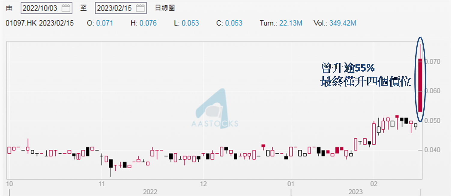 继领展 (0823) 宣布供股后,近日另一市场关注港企消息为有线宽带 (1097) 宣布将于今年6月1日起终止收费电视牌照,交还港府,日后专注发展现有三条免费电视频道业务。参考2011至2021年共十一年的年报资料,自2012至2021年连续十年之久收费电视客户数目都在减少,由2011年约110.6万名,降至2021年约71.5万名,又于2022年中期报告显示,截至2022年6月底的客户数目约68.3万名,累积减少逾三成八,反映管理层要剥离此业务可以理解。消息刺激股价昨日开报0.071元,较2月14日上午收报0.049元 (下午已停牌) 高近45.00%;之后更曾高见0.076元,最多升逾55.00%,证明市场解读消息利好。然而,最终收报0.053元,升幅不足10.00% (实则仅升四个价位,如下图),显然此乃大波幅股份。毕竟这是「仙股」,加上专营免费电视业务亦不代表基本面会显著改善,反观亏损扩大的风险高,故此进场前必须先审视个人风险承受能力。
