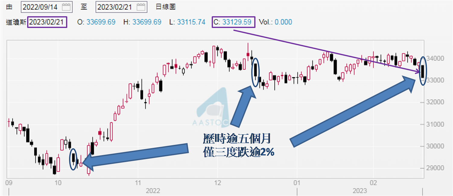 周二 (2月21日) 美股三项主要指数均跌逾2.00%,其中表现较佳的道指亦不例外,经已响起外围投资气氛转差的警号。道指收报33,129点,创1月20日以来新低收市。就跌幅而言,则为去年12月16日以来最大单日跌幅;而自去年9月14日以来,跌逾2.00%只有三次 (如下图),除了今次的2.06%,便见于去年12月15日的2.25%和10月7日的2.11%,反映今次是超过五个月以来的罕见单日大跌幅。自去年12月20日以来,未尝见道指连续两个交易日收低于33,000点,现较此水平相若不足130点,未来两周若见连续失守收市,要有美股进入跌势的心理准备,届时港股亦难独善其身。