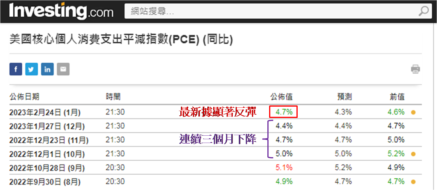 上周五 (2月24日) 道指收报32,816点,250天线在32,682点,只差约130点,就幅度而言相距更仅约0.40%,证明除了恒指,道指于本周失守250天线同样机会大,即港股和美股均见走弱。笔者认为港股短期走势会受美股拖累,皆因上周五美国公布1月份核心个人消费开支物价 (PCE) 为4.7% (如下图),高于市场预期的4.3%,亦较去年12月的4.4%高出0.3个百分点。这是连续三个月回落后首度见反弹,于去年11月和今年1月同见4.7%,令市场预期今年3月联储局要加息1/2厘显著升温。