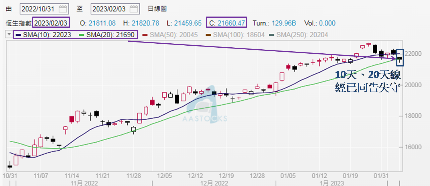 另可留意短周期的移动平均线,于今年整个1月,恒指未尝见连续两天收低于10天线,却于踏入2月不久的第二及第三个交易日均失守此线。再看20天线,自去年11月11日至今年2月2日,超过两个半月的每个交易日都收高于此线,但于2月3日亦告失守 (如下图),这等都是港股走势要转弱的讯号。至于市场关注的「牛熊分界线」(即250天线),自2021年7月26日失守后,直至今年1月4日才重新突破,事隔逾一年半,由于此乃长周期平均线,因此就算恒指续跌,认为2月跌破的机会微。