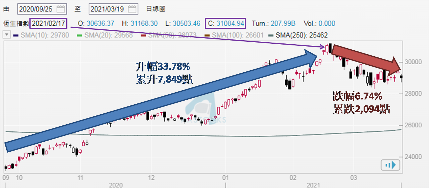 毕竟250天线现处20,204点,较2月3日收报21,660点低逾1,400点。当然,也有另一观点是以1月27日收报22,688点与21,660点比较,仅于五个交易日已累跌逾千点,现时距离2月完结仍有十七个交易日,再跌1,500点或以上不足为奇,所以本月能否守住250天线存疑。笔者尝试用上回跨越250天线的恒指表现,盘算到今年2月底恒指可能出现的位置。上回恒指大升浪始于2020年9月28日,前一个交易日 (9月25日) 收报23,235点,并于2020年11月5日起上破250天线,及后于2021年2月17日最高收报31,084点,期间升幅33.78%,上升7,849点。