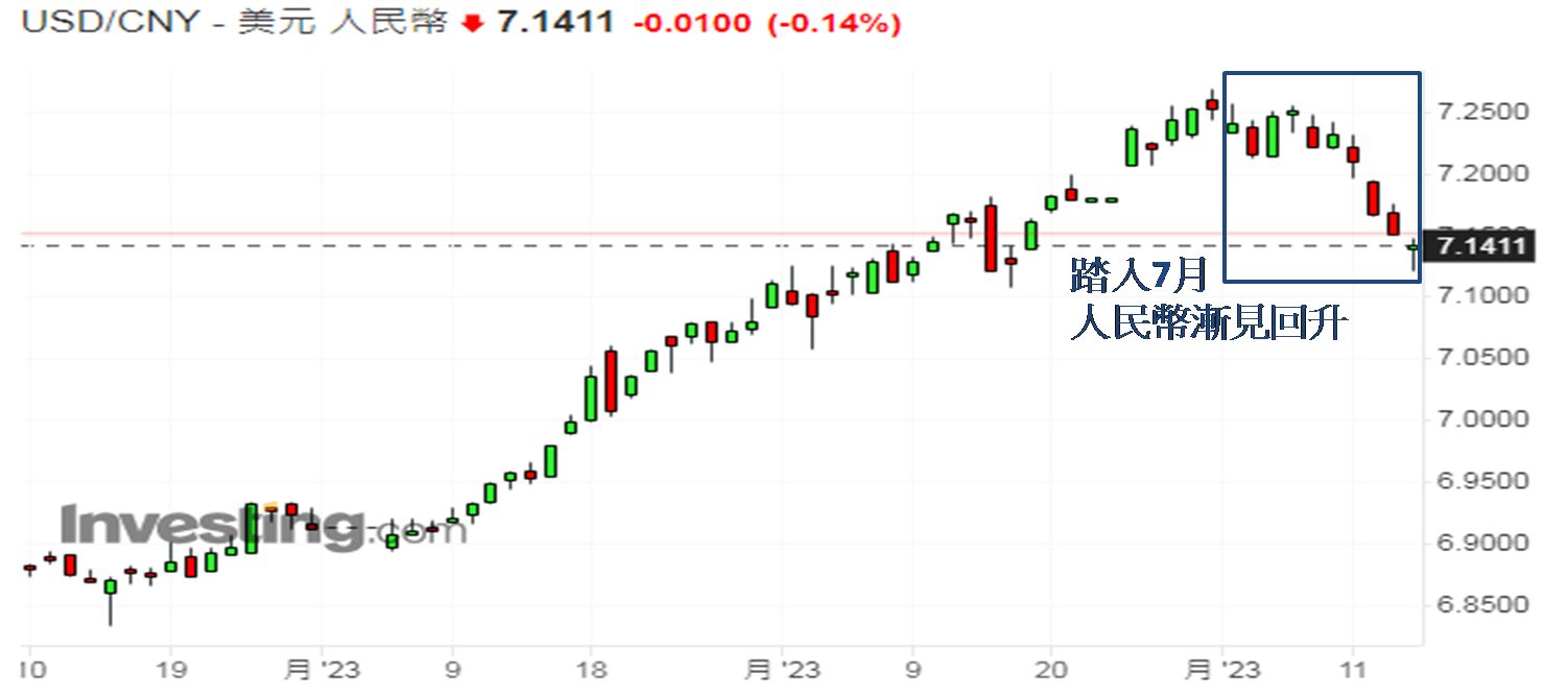 美元兑人民币在岸价从6月30日人民币最弱势时见7.2689至7月14日收报7.1411 (如下图),不足半个月人民币累升近1.79%。最近四个交易日 (7月11至14日) 更见四连升。今年已过了超过一半,仅见两度四连升,除了1月4至9日,便是如今,反映现属人民币罕见凌厉走势。年初至今人民币在岸价贬值3.42% (6.8972 → 7.1411),若非计及近日人民币回升,截至6月底最差之时,跌幅超过5.11% (6.8972 → 7.2689),以中国现为第二大世界经济体来说,属惊人跌幅。保守预期,人民币至少升值至7.1000水平才受阻。