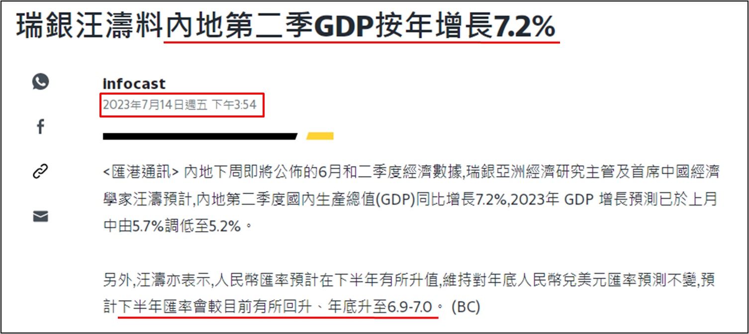 那么人民币会重上2022年9月水平,当时恒指和科指分别在19,800和4,300点水平,参考上周五 (7月14日) 收报19,413和4,228点,两者较去年9月水平差距均少于2.00%,证明人民币若非突破7.1000水平,短期人民币表现难为港股带来续升动力。本周焦点必然落在今日 (7月17日) 中国公布今年第二季经济增长之上,于7月13日发布市评文章已表示,7月11日中国社科院金融研究所发布2023年第二季度《中国宏观金融分析》报告显示,考虑到经济复苏动能放缓和低基数效应,第二季度GDP按年增速可能达到7%左右。