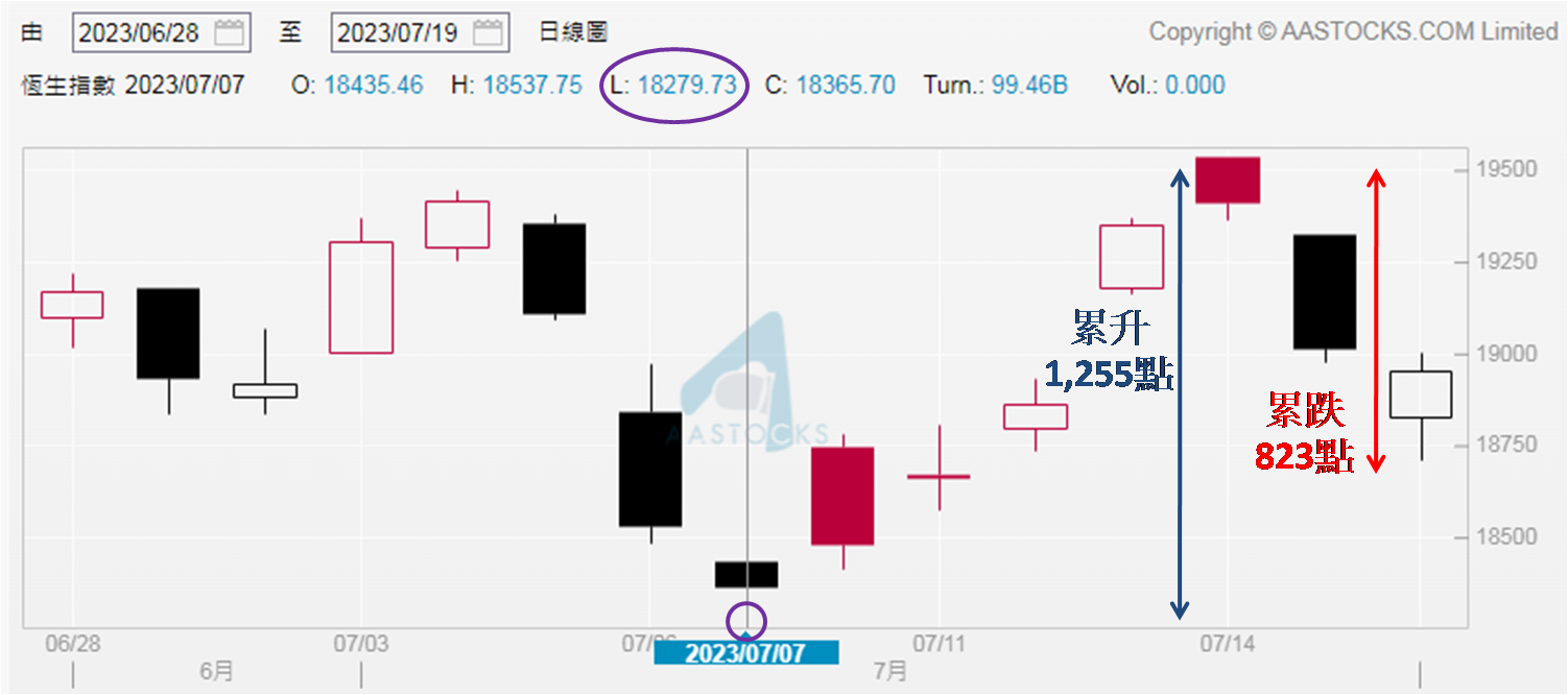恒指于上周见五连升强势后,本周却暂见连跌,若以7月7日低见18,279点计至7月14日高见19,534点,累升1,255点;又以19,534点,相对昨日 (7月19日) 低见18,711点,累跌823点,接近2/3升幅已蒸发,根据道氏理论的最大折返正是2/3,因未有超出折返上限,证明上周升势无被破坏。故此昨日开市不足40分钟低见18,711点,恒指便渐见上移,至尾市不足一小时高见19,004点,上移近300点;不过未能企稳在19,000点之上,最终收报18,952点,下跌63点,撇除周一因台风停市,本周暂见二连跌。