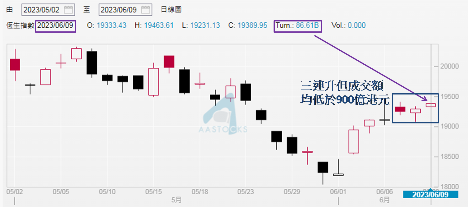 倘若6月8及9日也未能收高于19,300点,应有恒指继续「缺乏方向」的心理准备。如今终见突破收市,看来有突破于18,500至19,300点横行区的势头。当然,恒指现水平较19,300点高出不足90点,所以断言本周必会续升言之尚早,至少还要观察今日 (6月12日) 表现,仍见收高于19,300点,才可对后市走势感乐观。现时笔者依然在意大市成交金额情况,最近三日均低于900亿港元,年初至今只有三日成交额在800亿元以下,分别是5月2、3和16日,其中5月2和3日为内地假期港股通关闭,成交偏少可以理解。