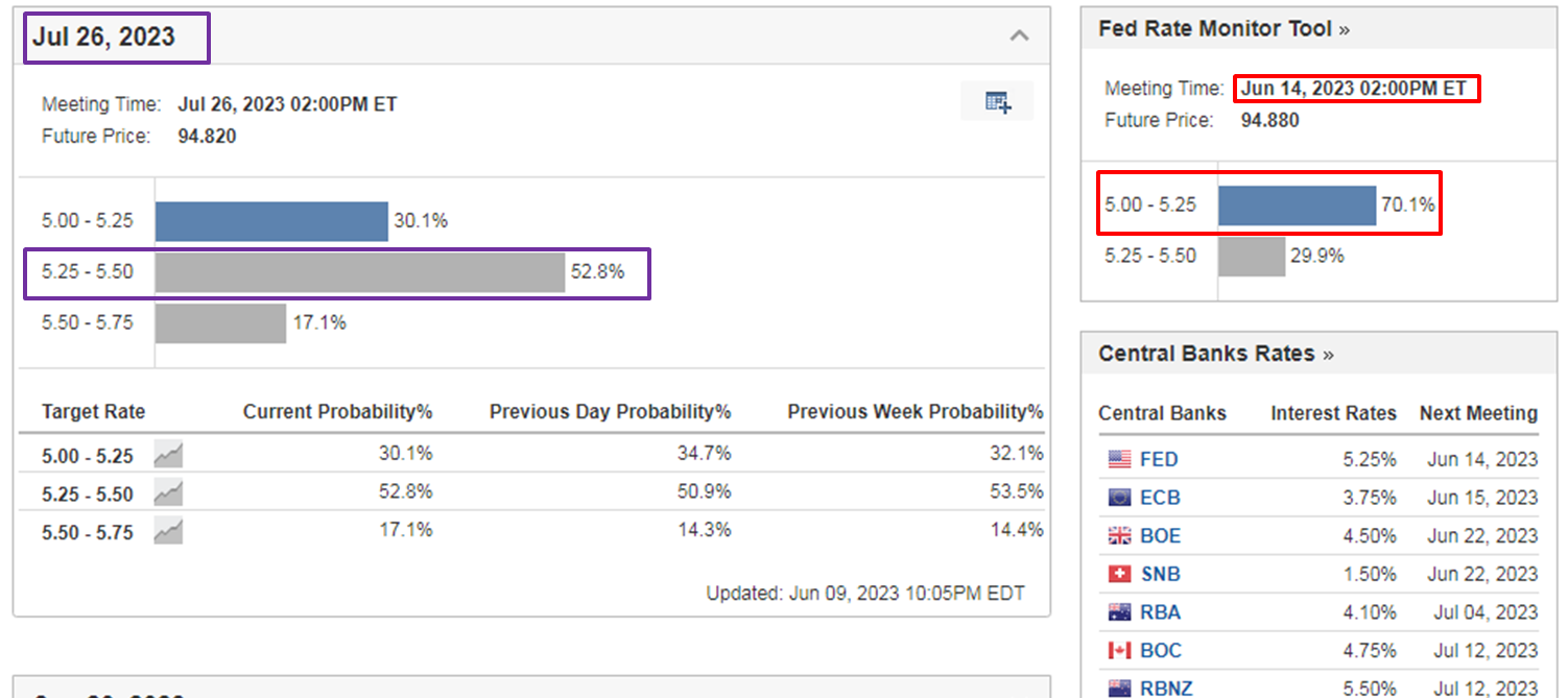 香港时间6月13日晚上8:30美国公布5月份居民消费价格指数 (CPI),4月为4.9%,由去年7月的8.5%计起,经已连续十个月CPI见回落,暂看5月数据进一步回落机会大,笔者预期会介乎4.5%至4.2%。若推断正确,联储局考虑继续加息的机率将锐减。香港时间6月15日凌晨2:00会公布议息结果,现时预期不加息机率逾七成;但7月加息1/4厘则逾五成,相信现属审慎估计,若然CPI公布数字真的在4.5%或以下,7月也不加息机率应会由现约三成见显著增加。另一关注行情是6月15日将公布的多项内地经济数据。