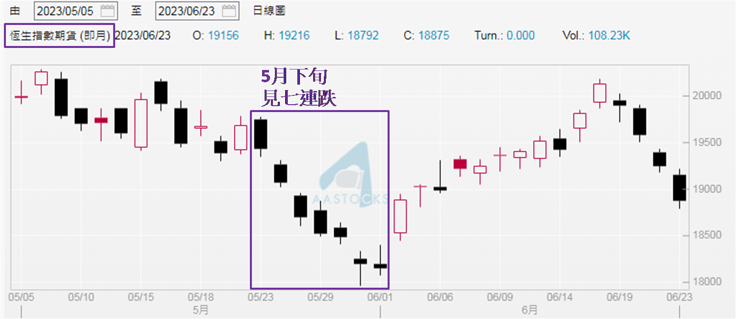 上周港股虽只有四个交易日,表现却可用一个字来形容,就是「差」,录得四连跌,由6月16日恒指收高于20,000点,为5月9日以来最高,不过自6月19日起见跌,四日累跌达1,150点,至6月23日收报18,889点,连19,000点关口也不补,回到6月2日水平。相对当日开报18,566点,只差300余点,反映6月初以来的升势,几乎全然消化,就连收高了半个月的20天移动平均线亦告失守,港股走弱经已明显不过。观乎港股夜期周末收报18,764点,下跌111点,相对6月16日收报20,127点,累跌已超过1,300点。