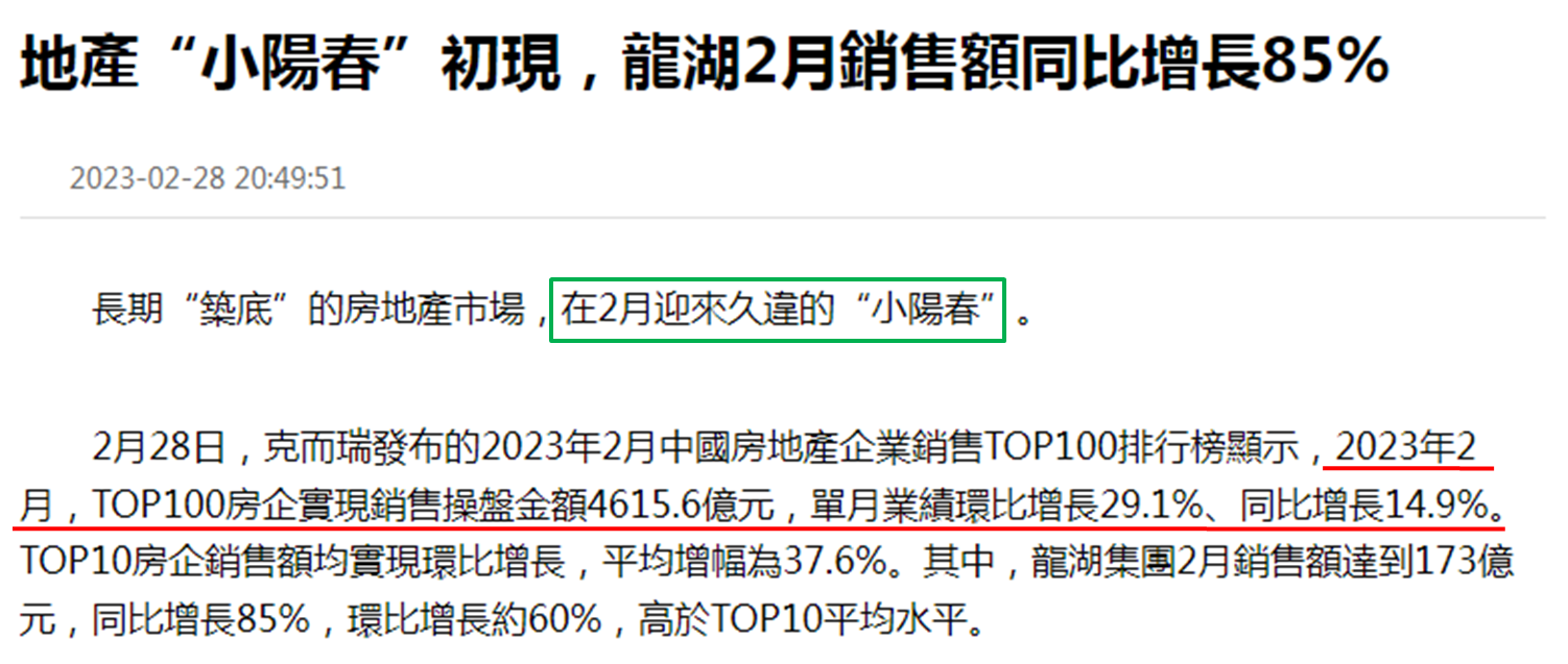 另见内地楼市销售有改善,物业买卖平台易居旗下克而瑞统计,2月内地首100大内房销售,超过一年半以来首次录得按年增长升两成九、至约4,616亿元人民币;按年就升近一成半,主要由于去年2月有农历新年假期导致基数较低,表现较好集中在国企和龙头民企。克而瑞认为放宽楼市调控后,置业信心恢复,而且多间内房准备推盘,3月有望出现「小阳春」。昨日多只大型内房股造好,龙湖集团 (0960) 和碧桂园 (2007) 分别上升9.60%和8.33%,其中龙湖是表现最好蓝筹股;越秀地产 (0123) 和中国金茂 (0817) 均升逾7.20%;绿城中国 (3900) 也升近7.00%。