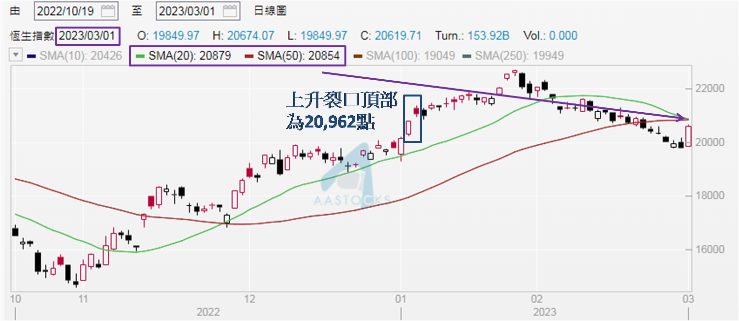 经过六连跌后,昨天 (3月1日) 恒指见大升,开市仅约一小时已升逾500点,截至上午11:00已高见20,380点,逼近10天移动平均线的20,400点水平,最终全日高见20,674点,收报20,619点,接近全日高位,升逾830点,自去年11月30日以来单日最大升幅,相信与多项中港利好消息带动有关。例如香港实施近三载 (始于2020年7月15日,历时959天) 的口罩令在昨天起解除,于香港全面复常有重大象征意义。多只本地零售及餐饮股份见上扬,其中周生生 (0116) 升近9.00%,多只股份也升逾3.00%,包括莎莎国际 (0178)、六福集团 (0590)、佐丹奴国际 (0709) 和利宝阁集团 (1869) 等。