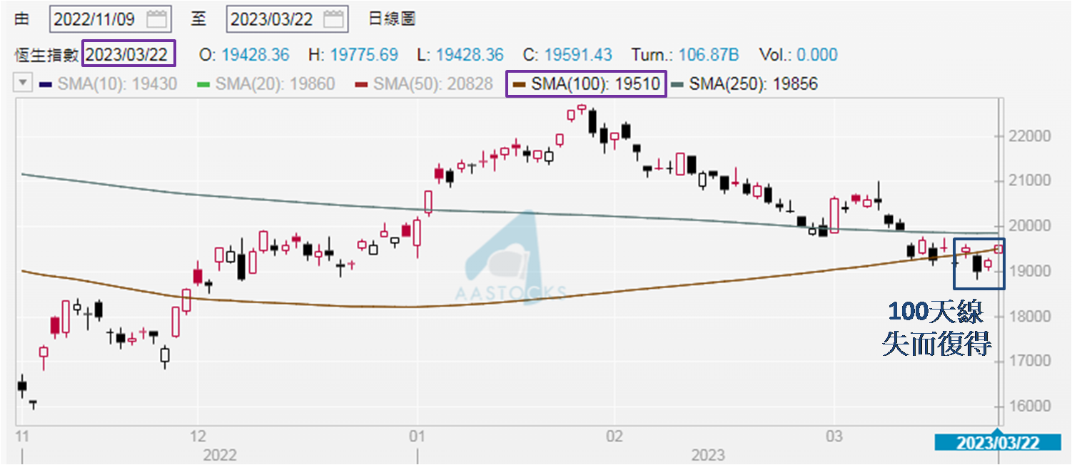 参考上述美股道指表现,银行业负面因素未被完全消化,回看港股,恒指昨收19,591点,较19,925点仍低逾330点,正是未能确认已重拾升轨的原因。另可留意3月9及10日之间见下跌裂口,介乎19,637至19,907点,证明现时恒指还未进入补裂口阶段。再看移动平均线位置,按昨日恒指收市位较具参考性为100天和250天线。前者处于19,510点,观乎3月17至22日的四个交易日收市位,恒指于此线是失而复得,属利好后市讯号;惟要多看两个交易日,同见收高于此线,方能确认后市表现可感乐观。